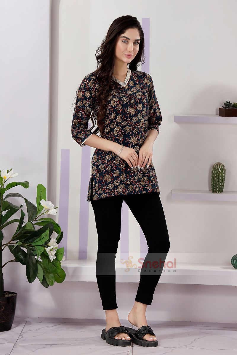 Add a touch of elegance to your wardrobe with our Navy Blue Color V-Neck Kurti. Crafted from premium flex cotton, this kurti ensures both comfort and style. The delicate lace embellishments add a sophisticated flair, making it perfect for both casual and semi-formal occasions. The vibrant tomato hue brings a fresh, lively look, while the V-neck design offers a flattering silhouette. Pair it with your favorite leggings or jeans for a chic and versatile outfit that's sure to turn heads.