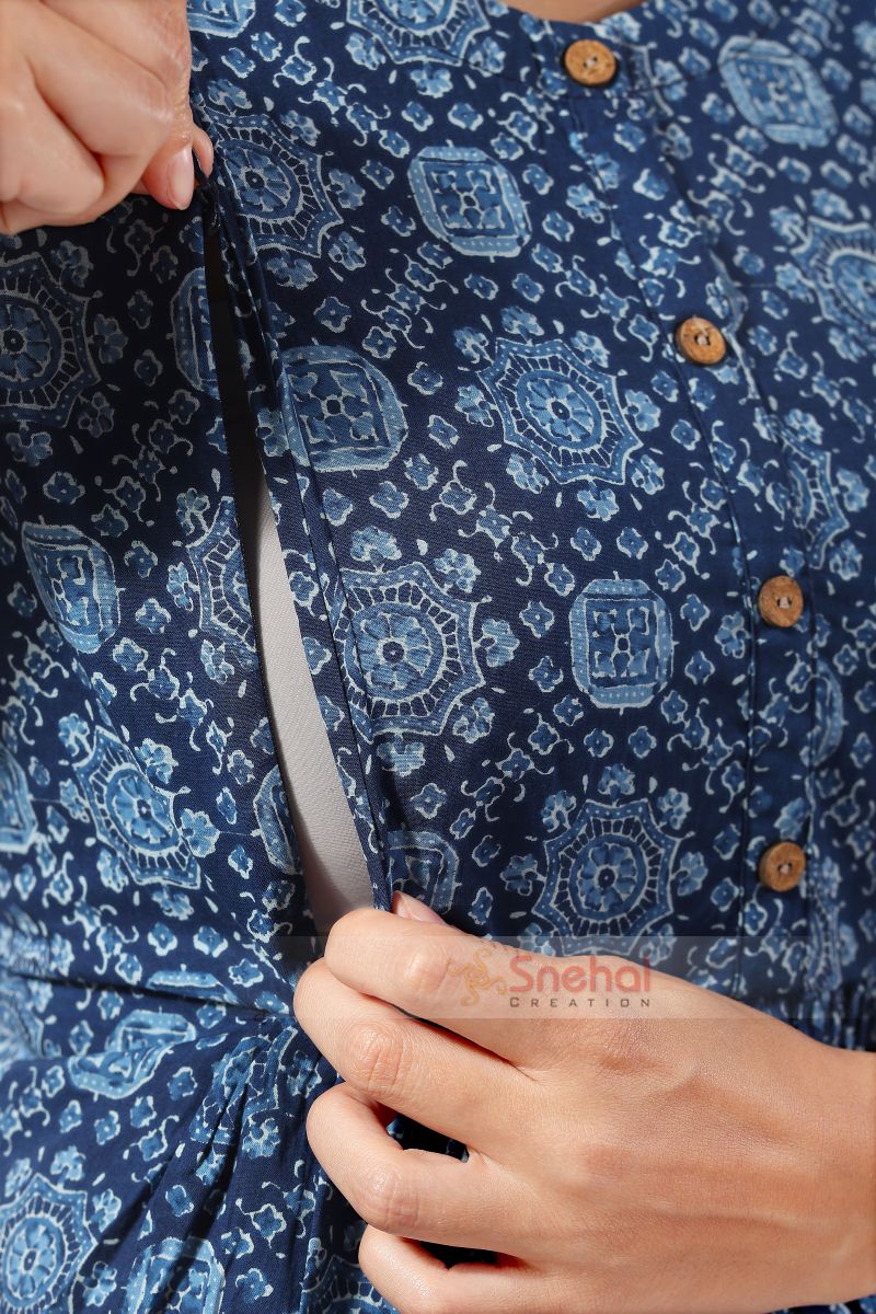 Navy Soft and Comfortable Cotton Printed Anarkali style Maternity-Feeding Kurti suitable for Mom during the pregnancy and after delivery while nursing. This Pure Cotton Batik Print Maternity-Feeding Kurti with zipper available in various sizes to take care of your nursing needs and yet keep you stylish! Perfect for photo-shoots,Outdoor visits,look cute and stylish.