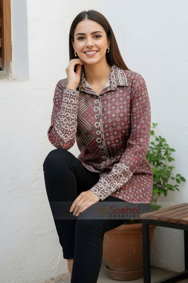 Add a touch of elegance to your everyday wardrobe with this stylish Azrakh print shirt style top. Crafted from premium modal fabric, it offers a soft and breathable feel, ensuring all-day comfort. The classic shirt collar with a functional button enhances the modern look, while the long sleeves with cuff detailing add a refined finish. Designed in a short length, this top pairs effortlessly with jeans, trousers, or ethnic bottoms, making it a versatile choice for both casual outings and office wear. The rich Azrakh print brings a timeless ethnic charm to this contemporary silhouette.