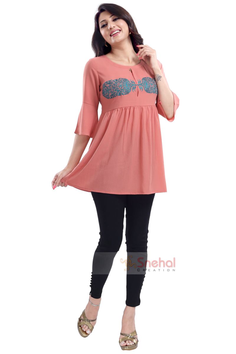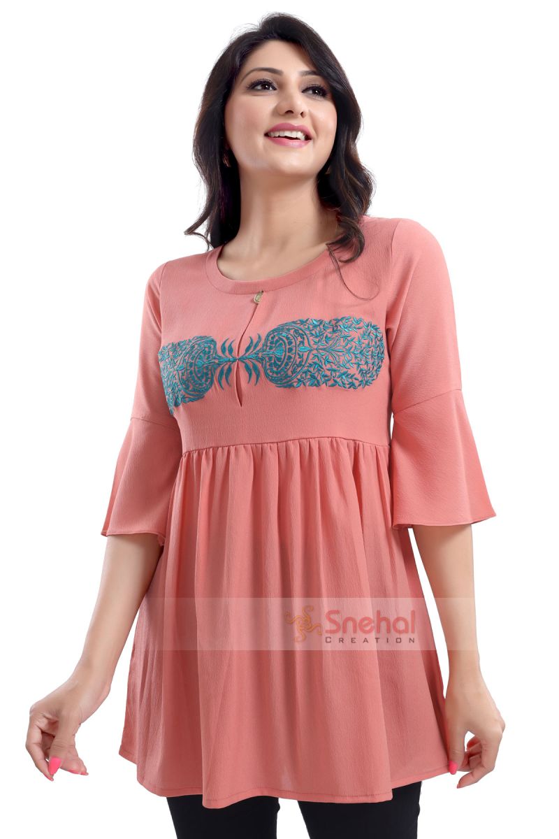 PERFECT PEACH STAR CREPE FABRIC WOMEN TUNIC TOP WITH EMBROIDERY WORK