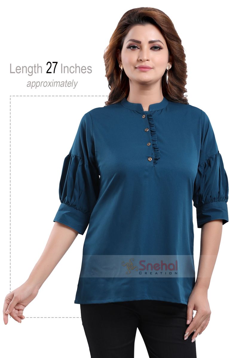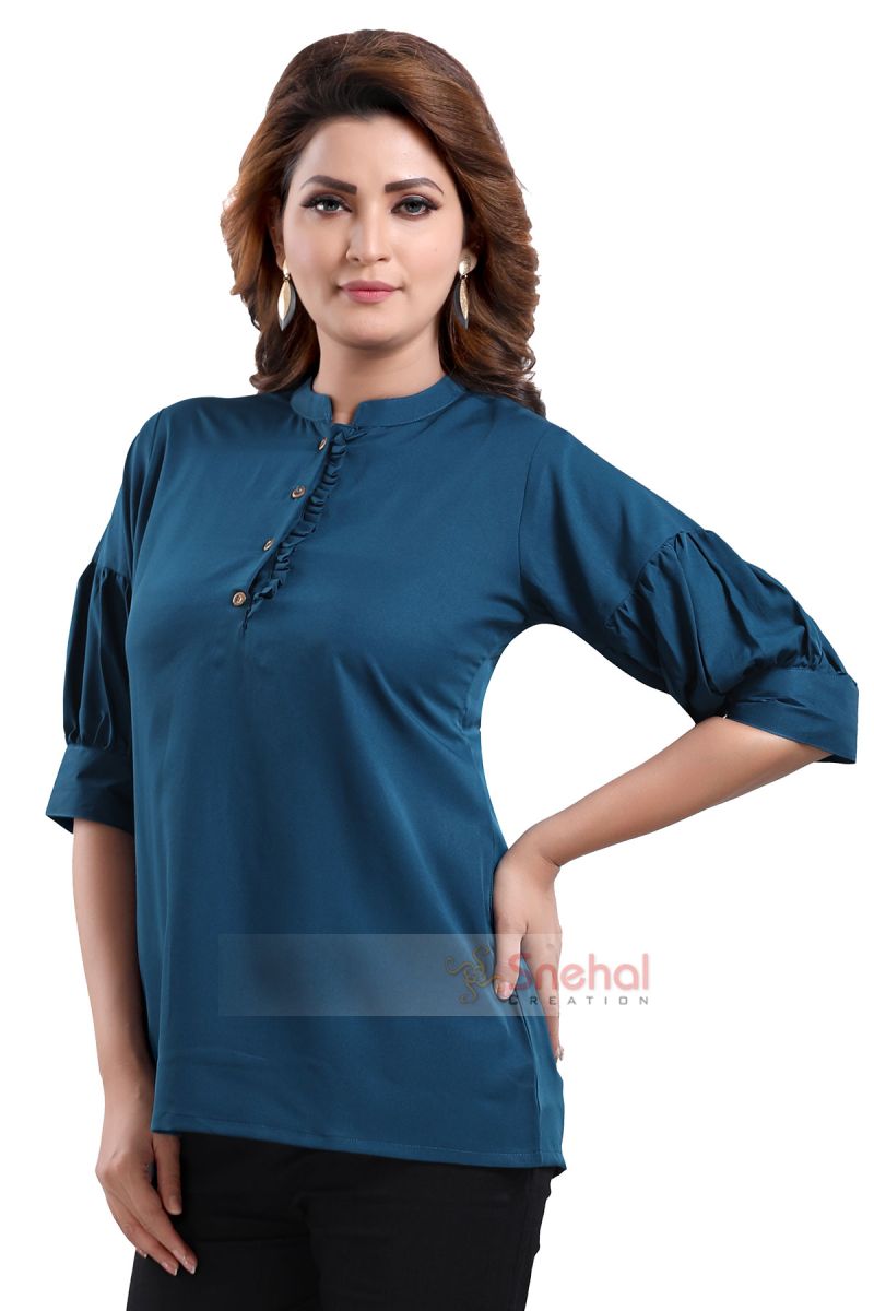Peacock Blue Color Poly Crepe Office Wear Short Tunic Top