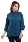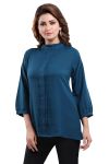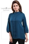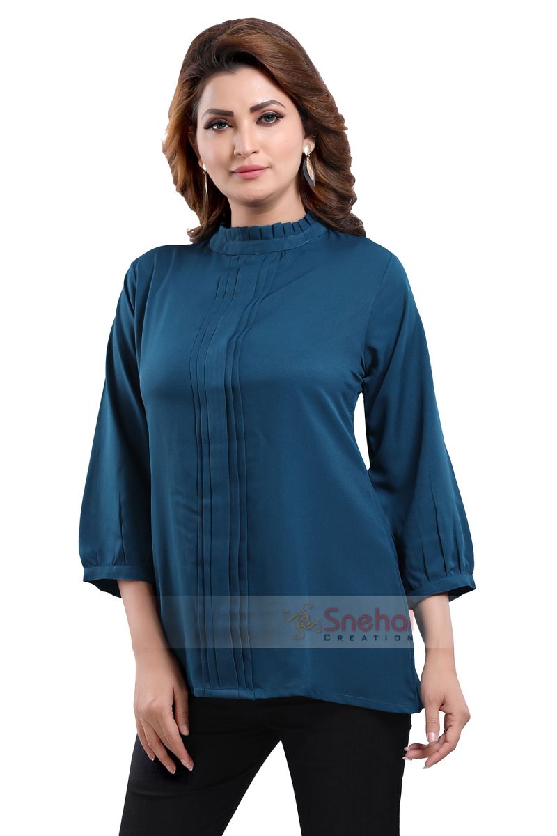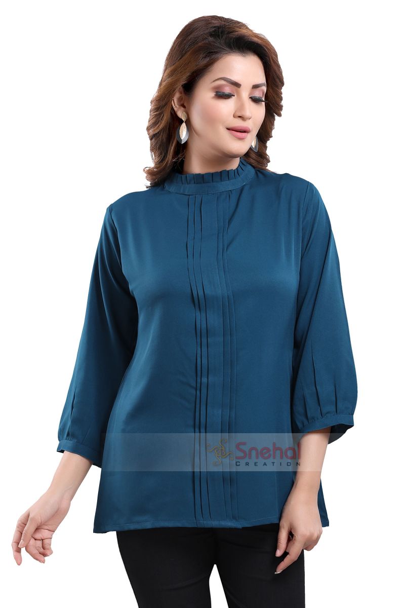 Get on your swag on a fun day out with friends as you wear this Peacock Blue Color Poly Crepe Office Wear Short Tunic Top from the house of Snehal Creations. This short style tunic has a front pleating pattern with ban collar. Asymmetrical pleats adorn each side of the tunic. The piece comes with long sleeves with cuffs and is a modern marvel when it comes to Indian clothing.