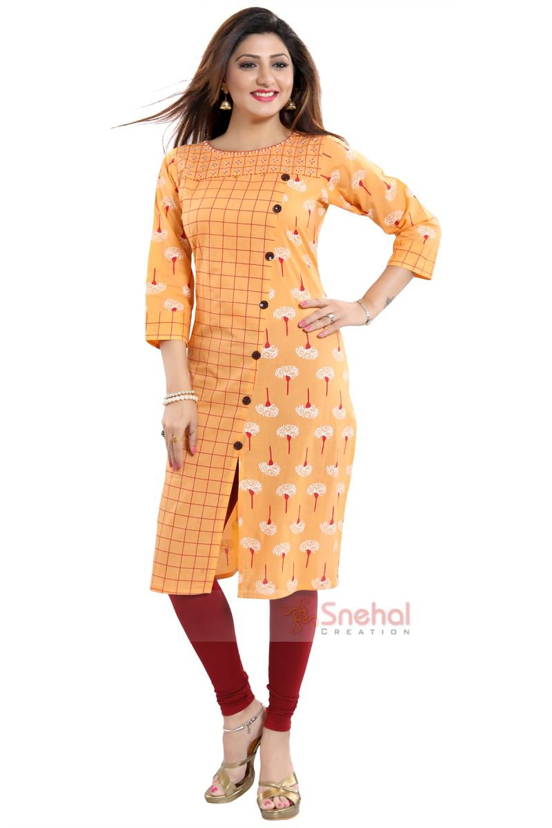 Parade in the sheer pride of the glamour that this Pearl Peach Asymmetrical Design Tunic Dandelion and Checkered Print Plus Button Detailing brings to your close. This Snehal Creation piece comes done in a combination of monochrome but distinctly printed fabric. An asymmetrical line separates the tunic at the front and is decorated with buttons. The sleeves also come in dandelion print along with checkered cuffs. The round neckline is decorated with minute red thread work detailing.