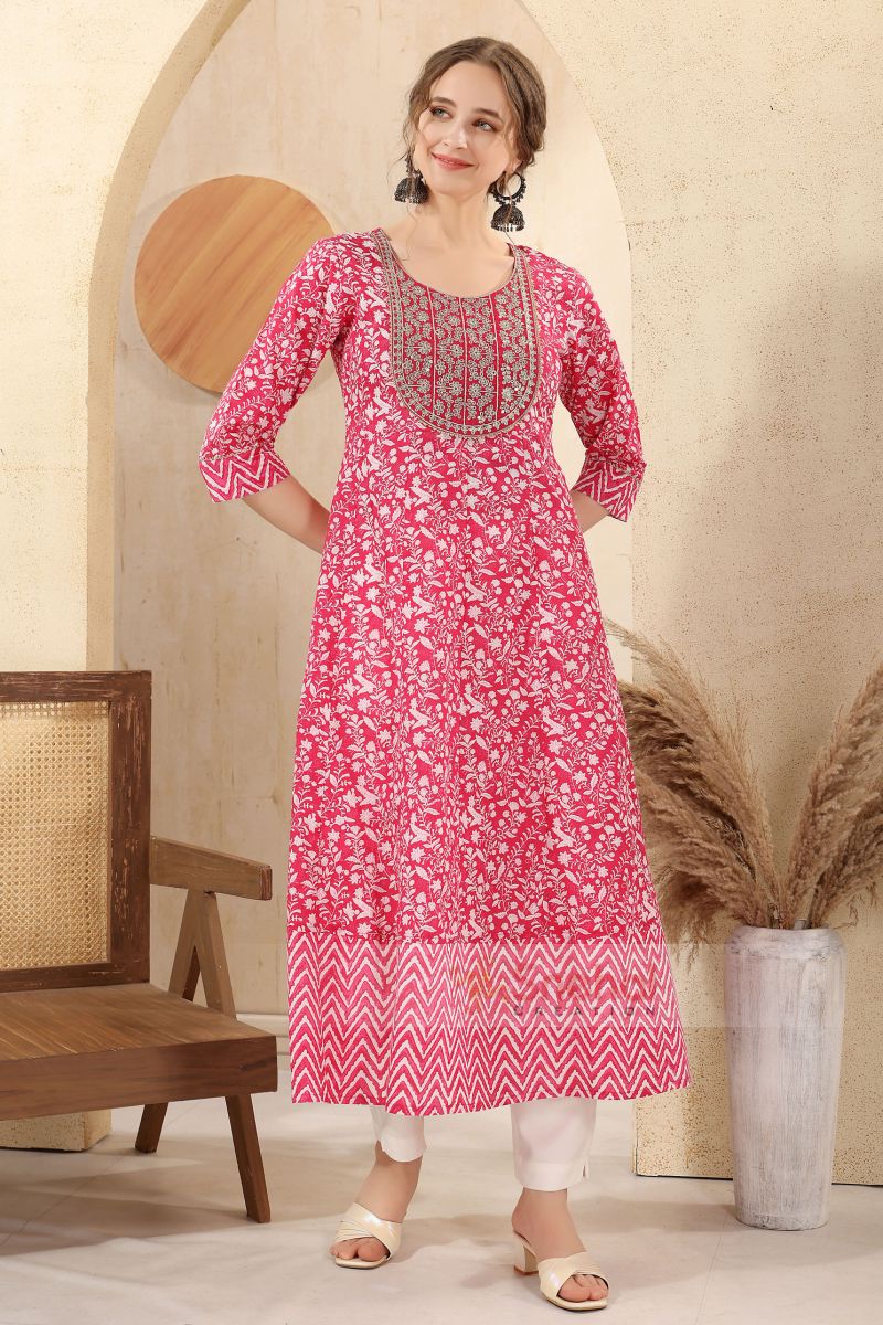 Pink Jaipuri Cotton Print Anarkali For Women With Zari Embroidery Yoke. Round Neck with Zari Embroidery and Beautiful Mix-n-Match print makes it exclusive and party wear.