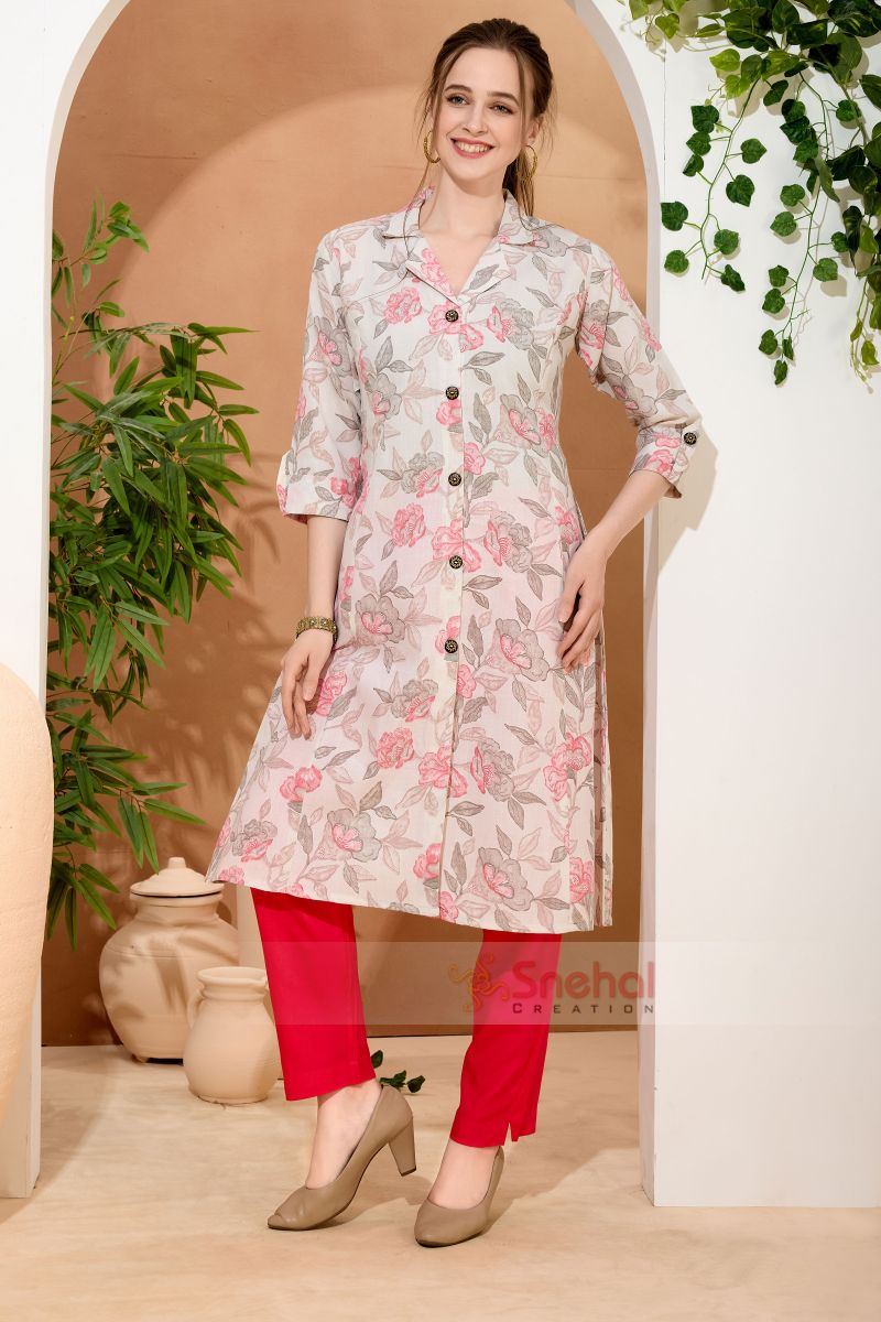 Pink Rose Flower Print Linen Cotton Princess Cut Long Kurta For Women. Can Wear like a dress. No side sleets. Coat Collar Pattern and Side Pocket