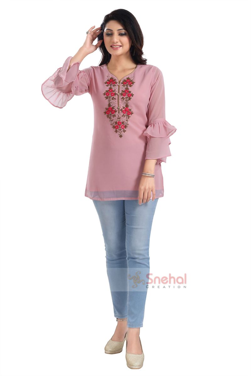 This designer Indian Tunic Top worked out in pink is ethereal and subtle. It has a delicate and exquisite work on the neckline. The sleeves are long and frilled. It is a perfect day wear. It is formal and classy. You would be the bearer of all the compliments with this attire on.