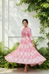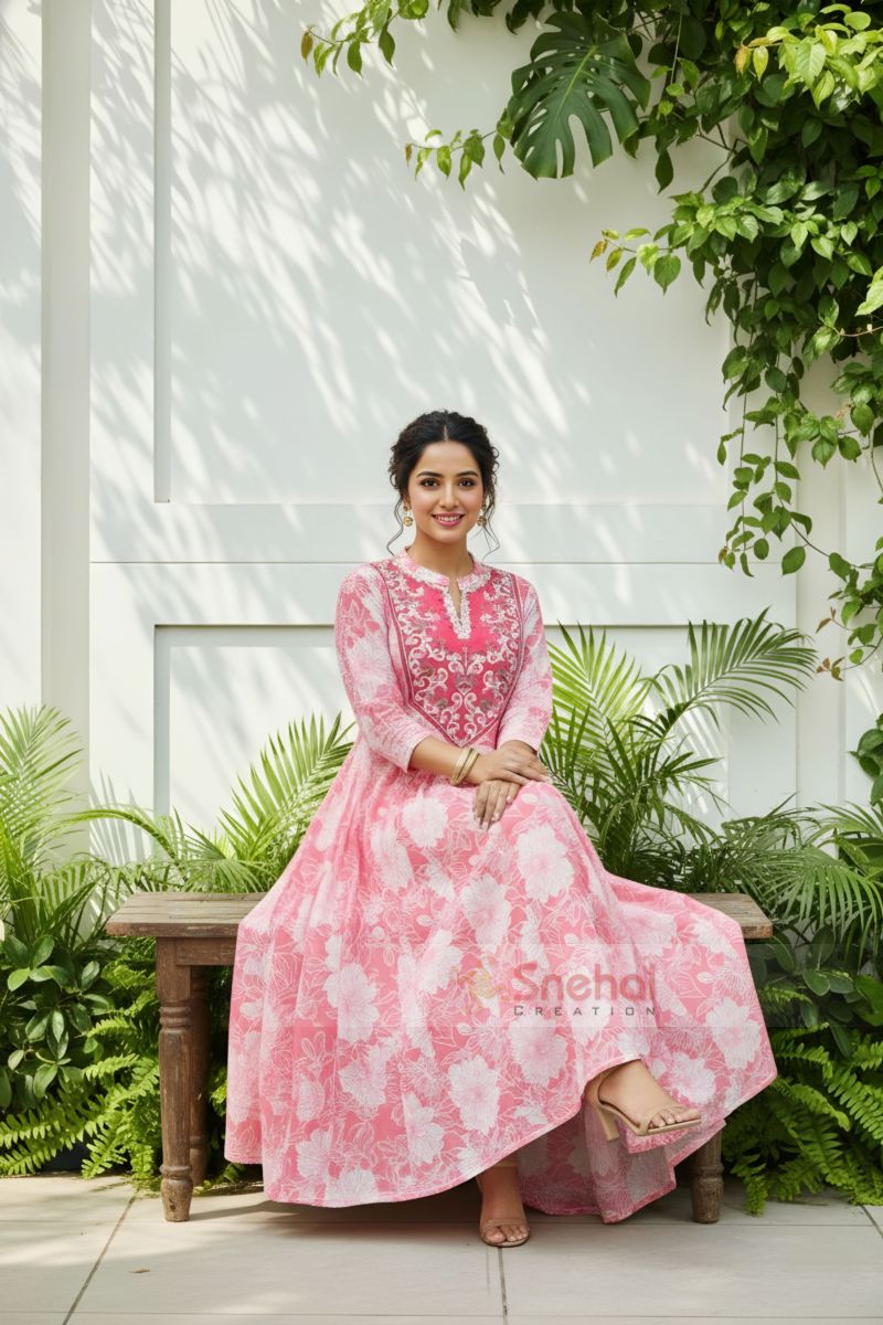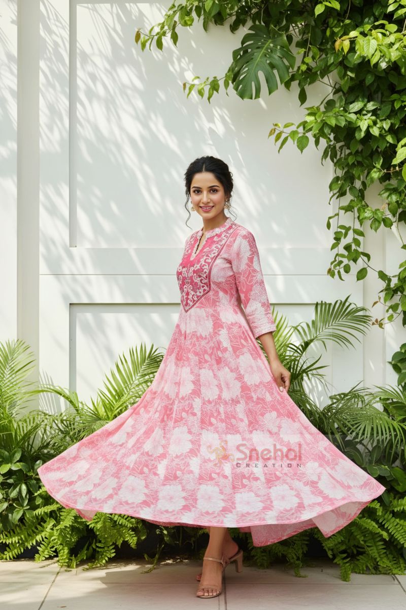 Pinky Pink Cotton Anarkali With Embroidery Yoke and Tussles. Full umbrella flair of 28 kalis for a graceful look.