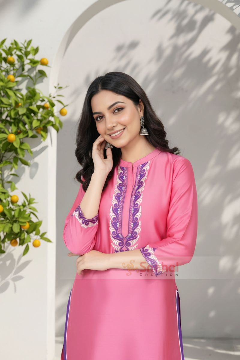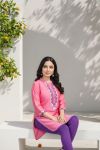 We have an answer to your style blues with this stunner Playful like Pinky Cotton Silk Short Tunic for Women from Snehal Creations. The carefully crafted cotton silk tunic has ban collar that is accompanied by a neck panel in purple and white embroidery that is nothing less than breathtaking. Similar embroidery adorns the sleeve edges that run third of sleeve length. Rounded edges at the chalk provide the distinct designer edge.