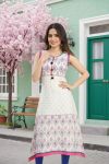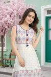 Clearly a winner; this Print Precious White A-line Designer Cotton Tunic from Snehal Creation is a total essential. This vivacious A line Tunic comes sans the sleeves. The print on the Tunic is Indian ethnic yet flamboyant. The gala Patti comes decorated with multi colored pom poms. There is slim taping that adorns the Tunic at various places.