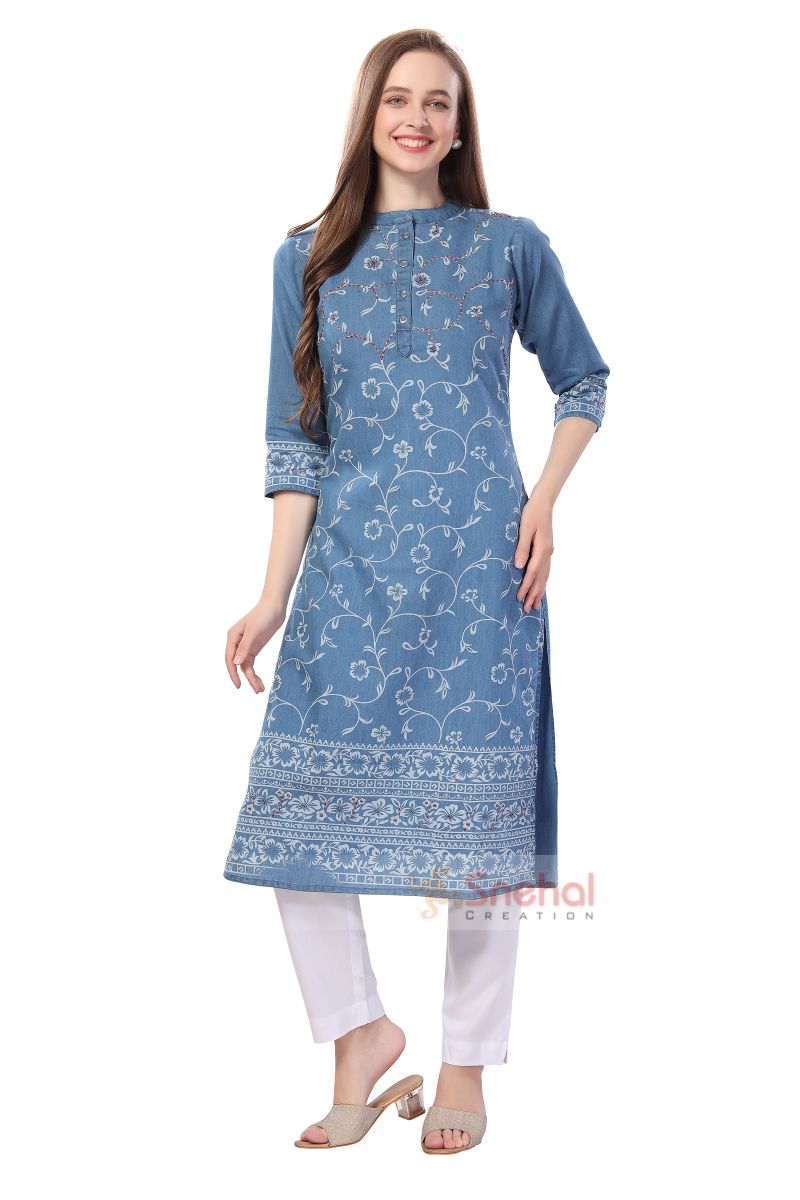 Your search for a durable piece of comfort clothing ends at this Pristine Floral Printed Denim Kurti With Thread Work from the house of Snehal Creations. This round neck beauty has three fourth sleeves. The front of the tunic body comes printed with picturesque floral pattern. The sleeves are plain with the design printed on the ends, which match the border at the hemline.