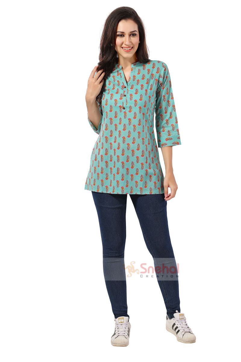 Mehandi-Green-Cotton-Printed-Short-Tunic-Top