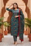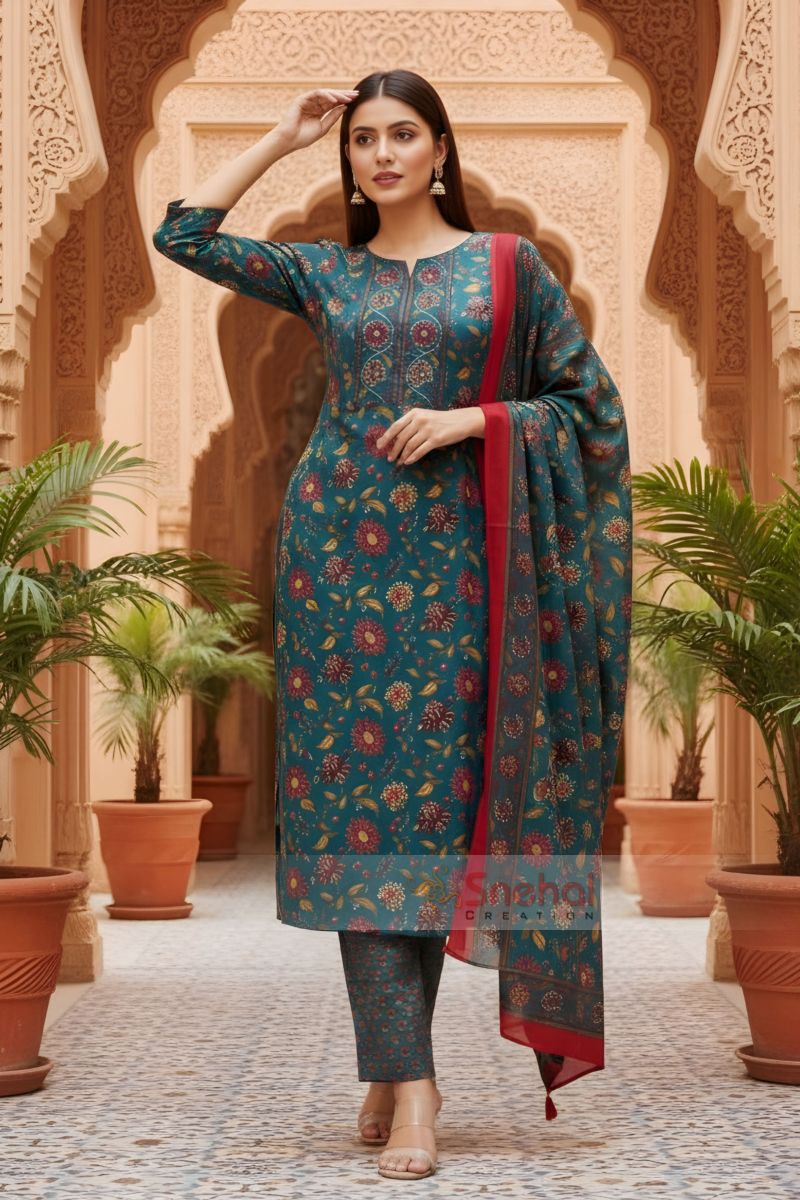 Elevate your ethnic wardrobe with this elegant Rama color Jaipuri cotton printed 3-piece suit set, designed to blend traditional charm with everyday comfort. Crafted from soft and breathable cotton fabric, the kurta features classic Jaipuri floral motifs that add timeless appeal.