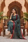 The highlight of this suit is the beautifully detailed front neckline, adorned with subtle zari embroidery, enhancing the overall look with a refined festive touch. Paired with a coordinated printed pant and a matching dupatta finished with a contrasting border, this ensemble is perfect for festive occasions, office wear, and graceful day outings.
