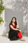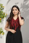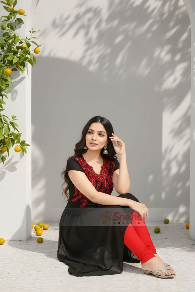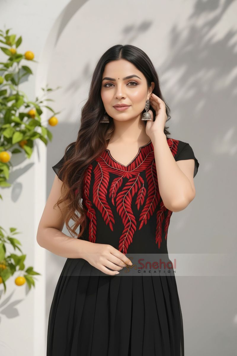 Fill up the dearth for designer clothing in your wardrobe with this avantgarde Ravishing Black Georgette Designer Tunic with Red Threadwork. Short sleeves and curved neck the tunic is adorned with beautiful red thread embroidery done by machine. Below the belt line the tunic is silhouetted like a dhoti loosely pleated and balloon shaped. Team it up with red cigarette pants.