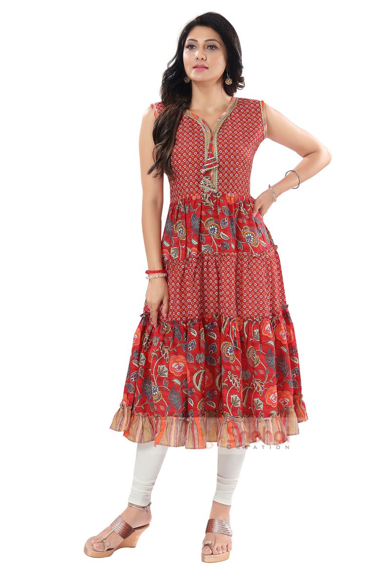 ‘Utterly attractive’ is the word that comes to mind when you look at this Ravishing Red Rayon Flared Anarkali Style Kurti Tunic with immense pride by Snehal Creations. The tunic has been wrought by red print motifs and flowers. The rayon cotton tunic comes with a simple round neck yoke taped with gota laces and fancy hangings.The anarkali flare of the tunic makes it all the more worth buying!