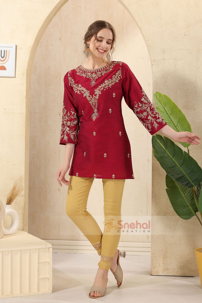 Embrace elegance with this magenta tunic crafted in raw silk. Beautiful golden embroidery on the front and sleeves adds a stunning touch to your wardrobe.