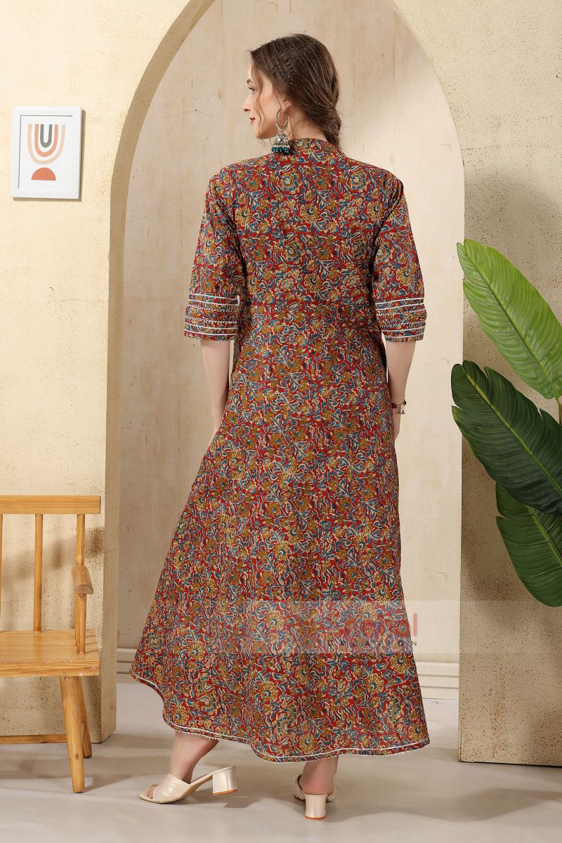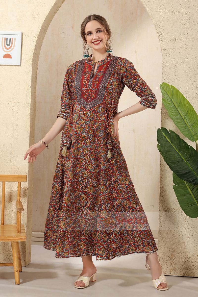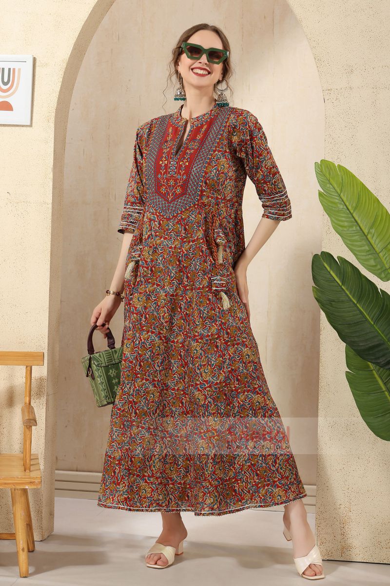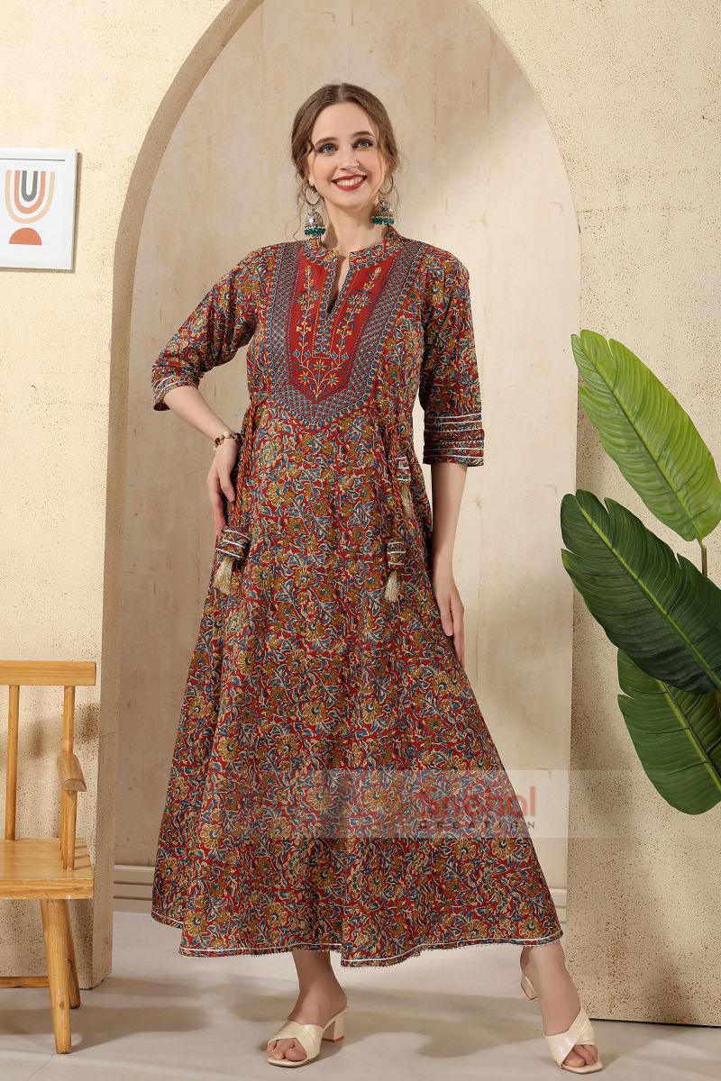 Red Cotton Paisley Print Anarkali With Embroidery Yoke and Tussles. Elegant gota laces at sleeves and flair. Full umbrella flair of 28 kalis for a graceful look.