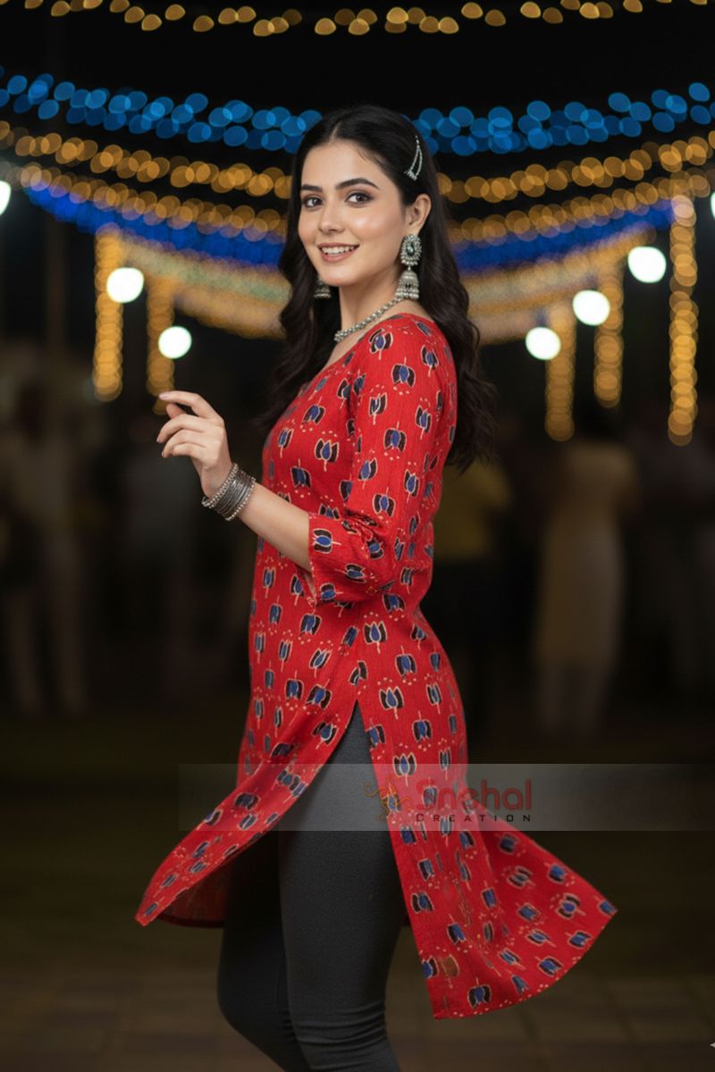 Indigo Blue Dabu Print Kurti With Bell Sleves