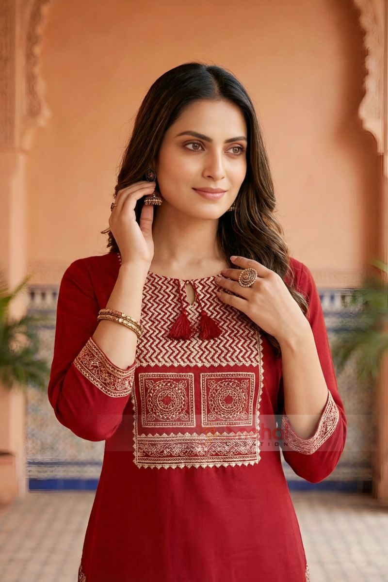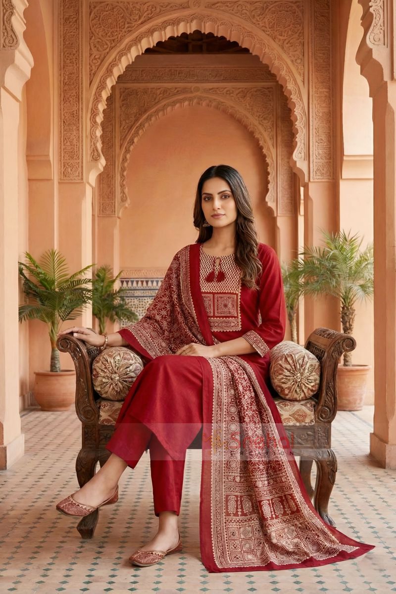 Elevate your ethnic wardrobe with this elegant Red Jaipuri Cotton Kurta Pant Dupatta Set With Printed Yoke And Dupatta, designed to blend traditional charm with everyday comfort. Crafted from soft and breathable cotton fabric, the kurta features classic Jaipuri azrakh motifs that add timeless appeal.