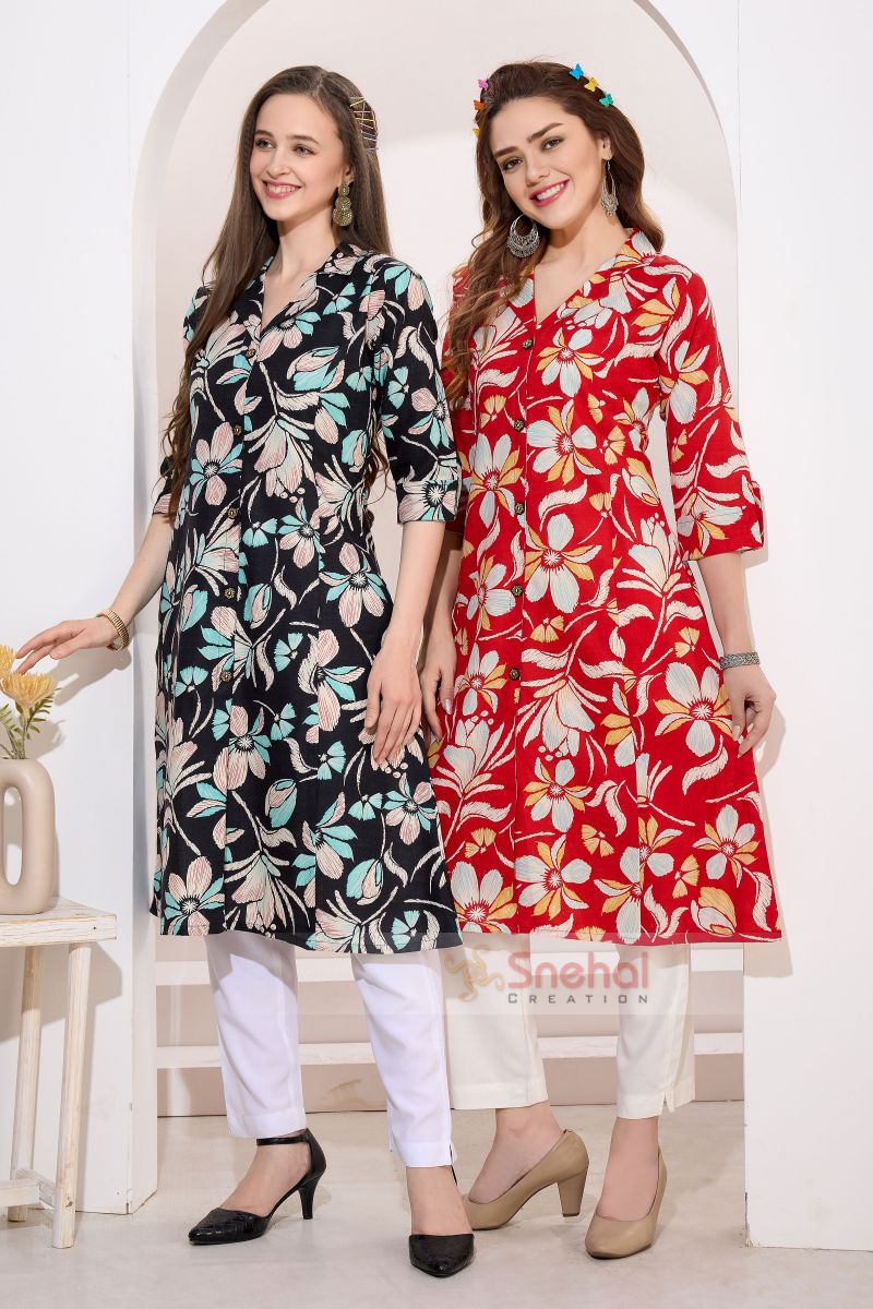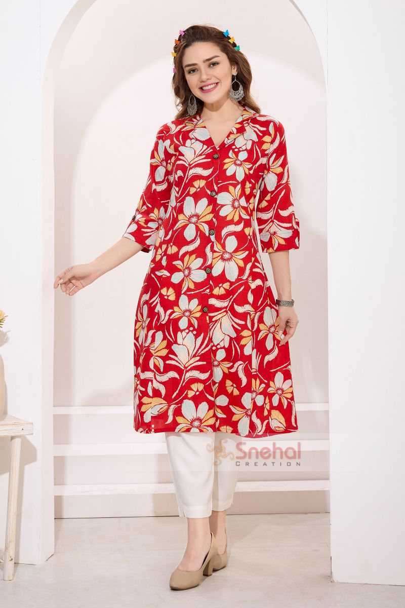 Red Linen Cotton Princess Cut Long Kurta For Women. Can Wear like a dress. No side sleets. Coat Collar Pattern and Side Pocket