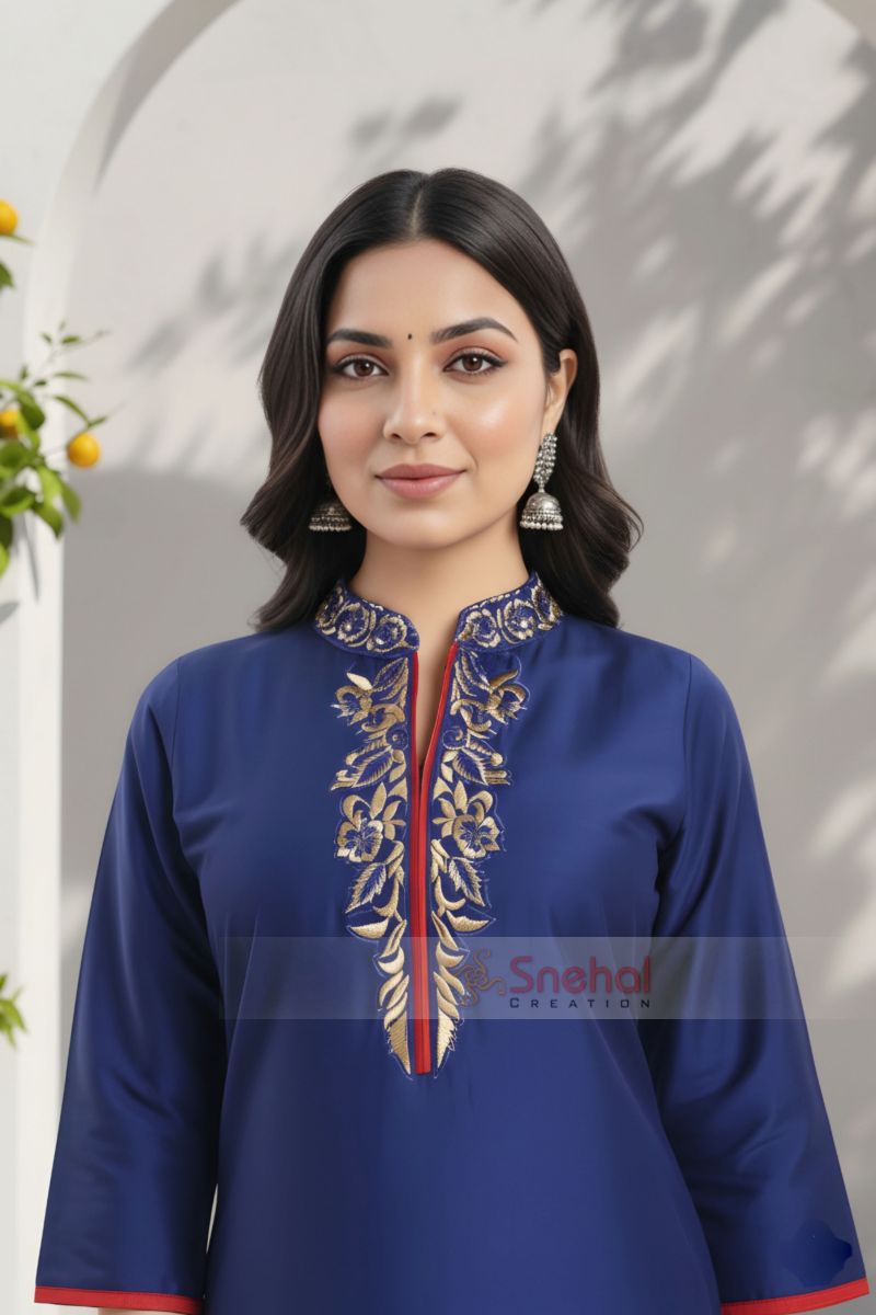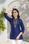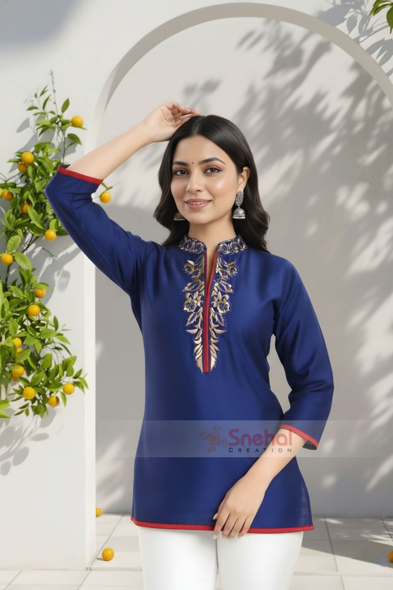 March about the city when you swathe this Regal Affair Royal Blue Raw Silk Short Tunic Top with Gold Thread work from the house of Snehal Creation. This short piece of silken clothing is a good semi formal wear option and comes with a ban collar decorated in heavy gold embroidery and three quarter sleeves. A pair of white pants will compliment it befittingly.