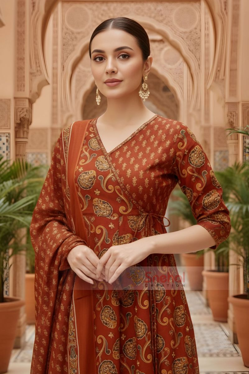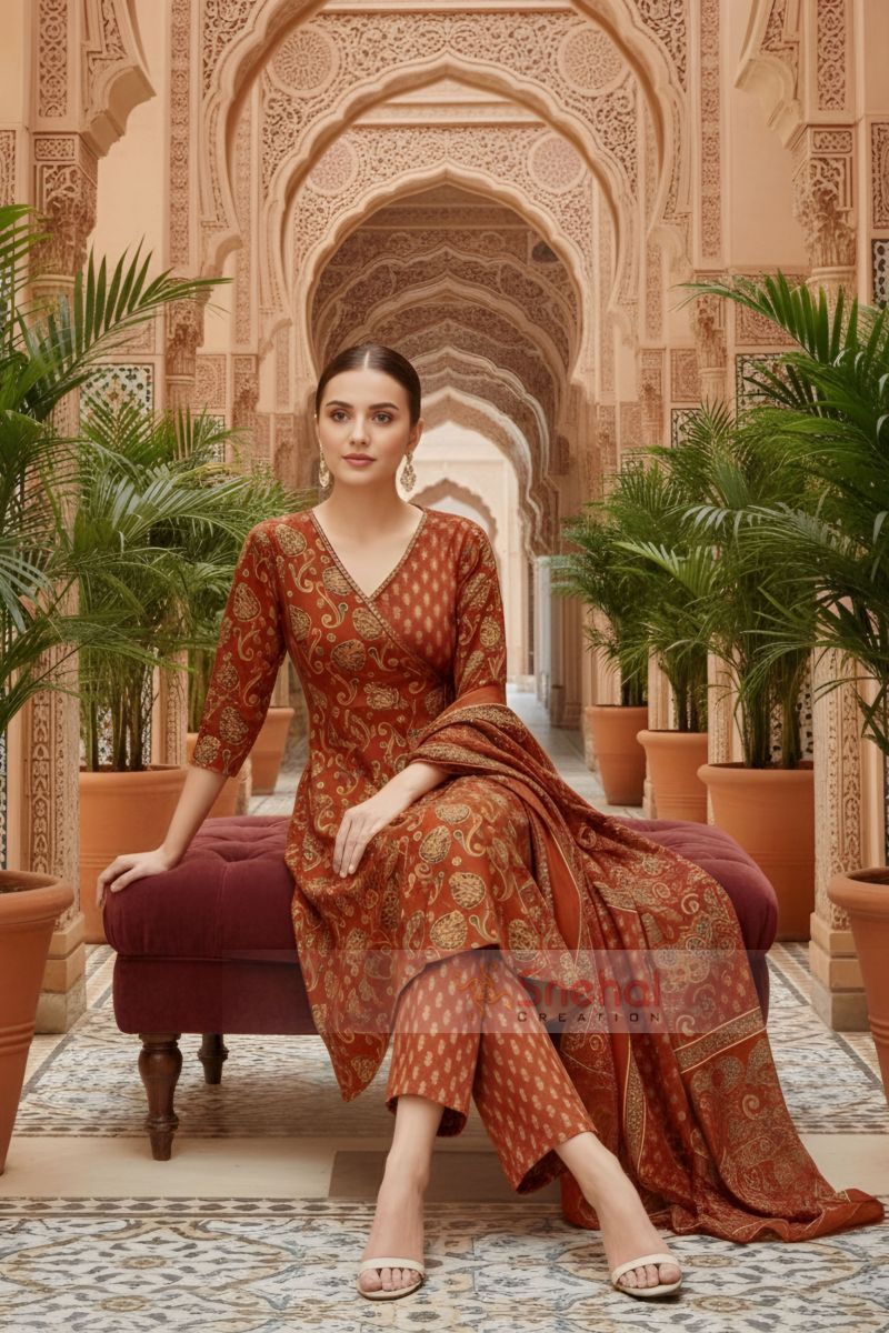 Embrace graceful ethnic charm with this rust Jaipuri print cotton flared 3-piece suit set. Crafted from soft and breathable cotton, the flared kurta features authentic Jaipuri motifs that create a beautiful flow and timeless appeal. Paired with a coordinated pant and an elegant printed dupatta, this ensemble is ideal for festive occasions, ethnic gatherings, and stylish everyday wear.