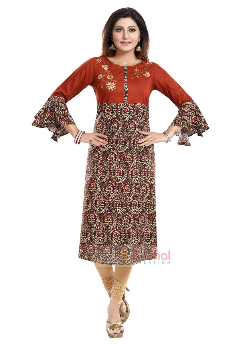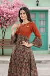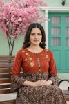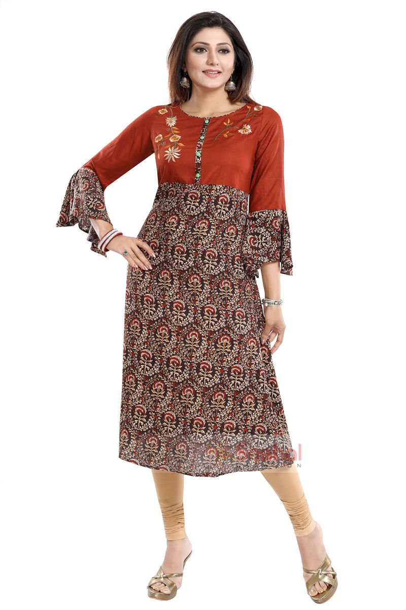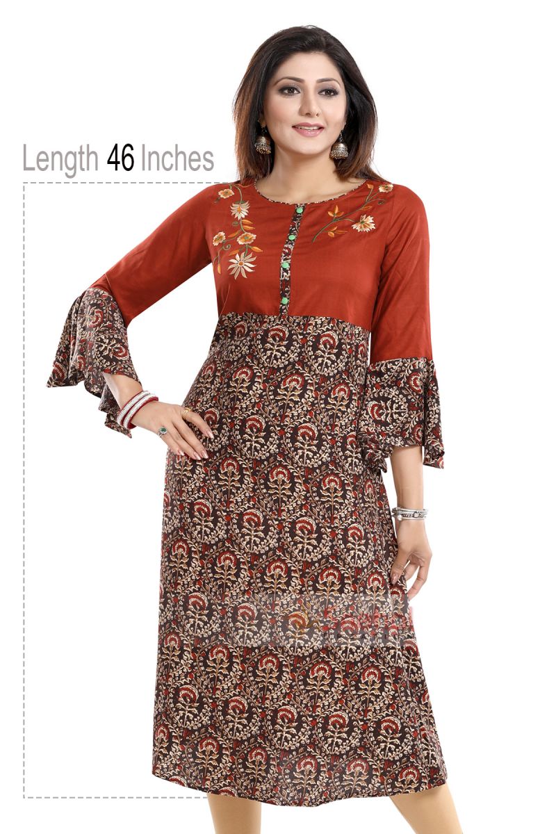 Jazz up the fun quotient of your wardrobe with designer pieces like this Rust Rayon Printed Flared Long Tunic With Floral Embroidery and Designer Umbrella Sleeves from the house of Snehal Creations. This round neck tunic follows an empire cut silhouette followed by a printed flared lower half. The yolk of the tunic is crafted out of plain rust fabric that comes decorated with beauteous floral embroidery and a printed gala patti with buttons. The sleeves of the tunic are three quarters on the whole structured to feature both plain and printed fabric an an umbrella cut. Team it with any thing rust for bottoms