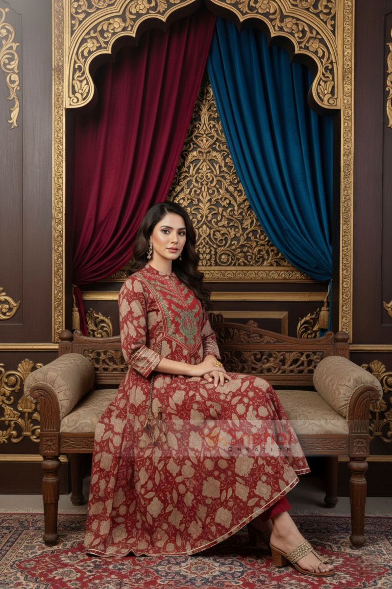 Rust With Lust Cotton Anarkali With Embroidery Yoke and Tussles. Full umbrella flair of 28 kalis for a graceful look.