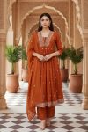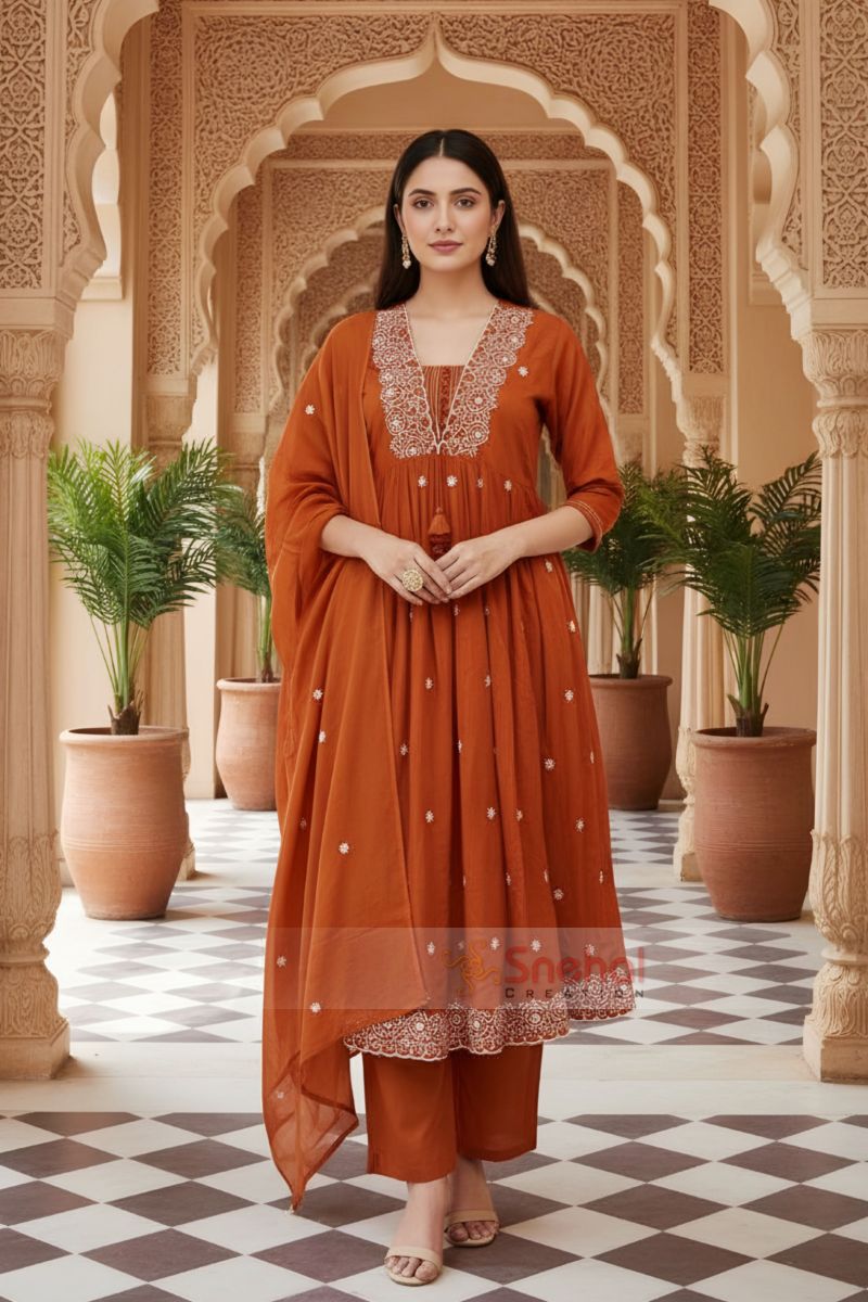 Shop elegant mustard Jaipuri print cotton flared 3 piece suit set for women with kurta, pant and dupatta. Perfect for festive and ethnic wear.