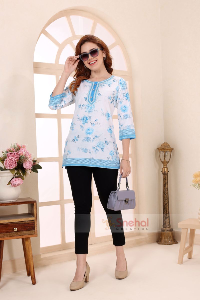 Sky Blue Cotton Short Kurti Tunic Top with Floral Print for Women