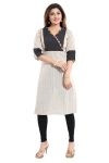 Sway in style as you don this Smart Silhouette South Cotton Kurti with a Design Twist from the house of Snehal Creation. This V-neck tunic comes with a unique overlap design on a black coloured panel below the neckline. The main body of the tunic features checkered off white fabric and is tailored to have an A-line silhouette. The cuffs of the three fourth sleeves are black in colour to match the neck panel.