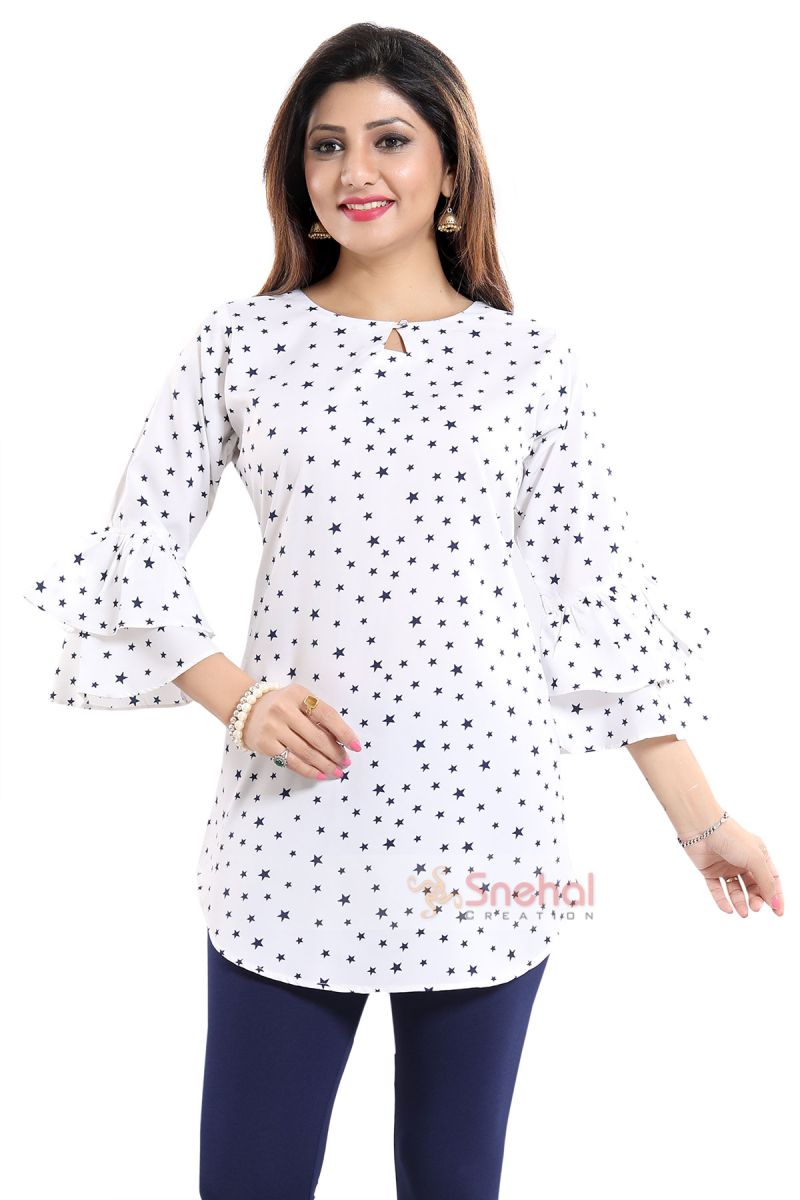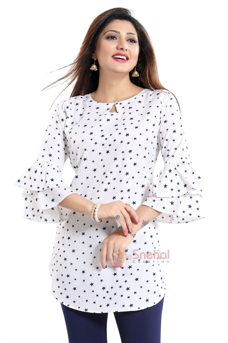 Grab everyones attention as you move around wearing this Star Attire White Poly Crepe Short Kurta with Frilled Sleeves from the house of Snehal Creations. This simple tunic top has a round neck and three fourth frilled sleeves. The main body of the tunic follows a straight cut silhouette and has an apple bottom. The start print on the fabric is a current bollywoodfavourite.