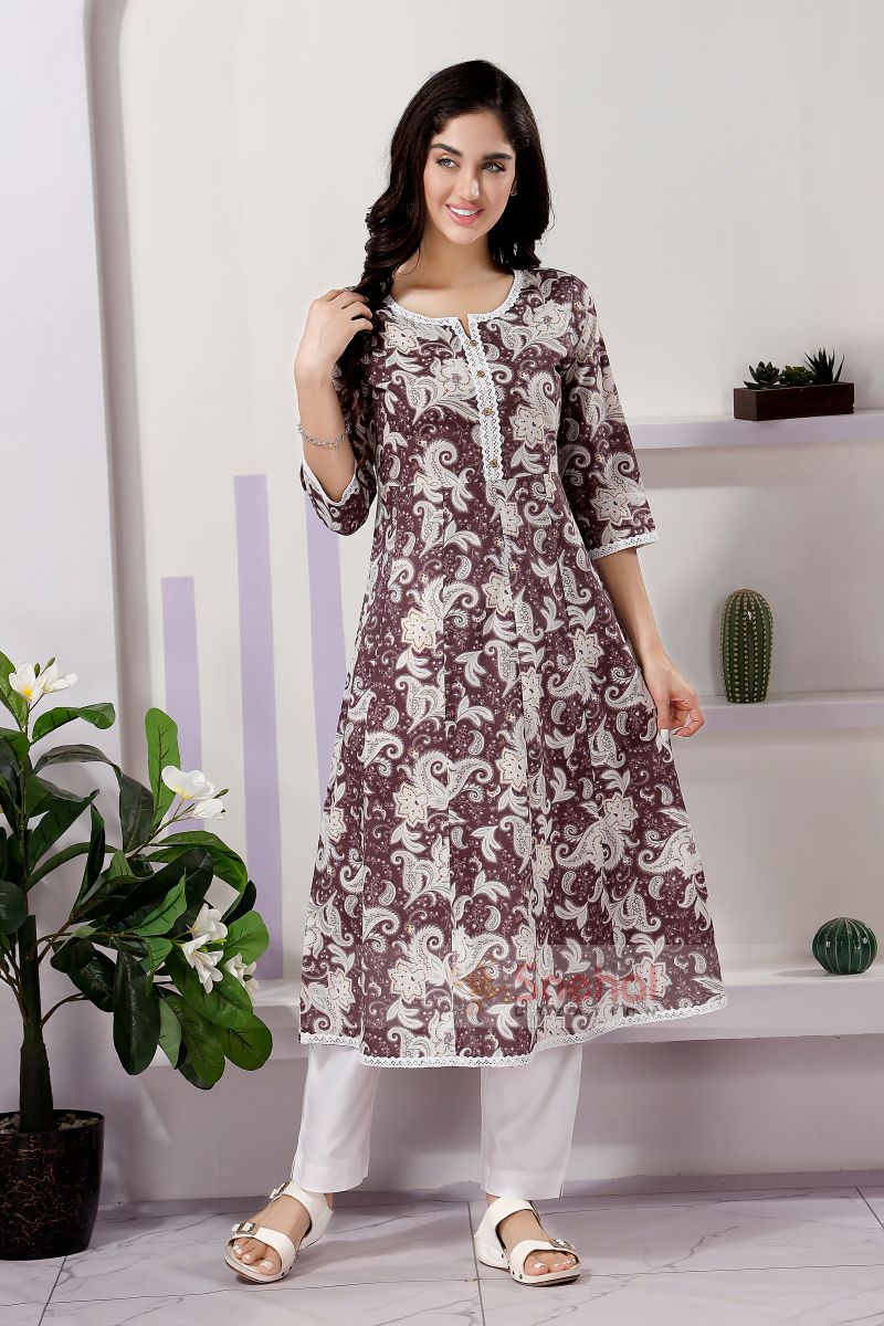 Discover elegance with our Stylish Brown Mix N Match Long Print Cotton Anarkali Kurti, crafted from high-quality cotton for unmatched comfort and style. This kurti features a vibrant coral hue, beautifully complemented by mixed print patterns that add a unique and contemporary touch. The Anarkali silhouette provides a flattering fit, while the breathable cotton fabric ensures all-day comfort. Perfect for casual outings, festive occasions, or everyday wear, this kurti combines traditional charm with modern aesthetics. Pair it with your favorite leggings or palazzos to complete the look. Embrace the blend of style and comfort with this must-have addition to your ethnic wardrobe.