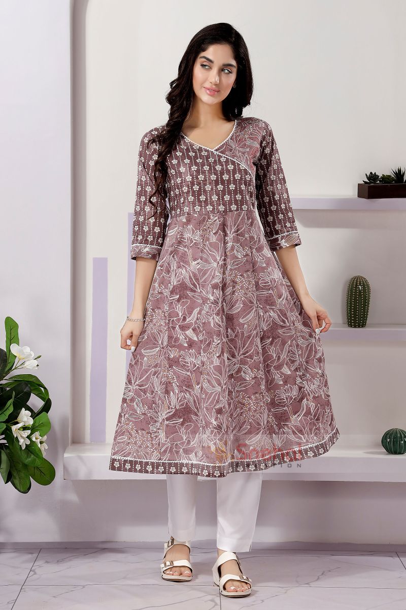 Discover elegance with our Stylish Brown Mix N Match Print Cotton Anarkali Kurti, crafted from high-quality cotton for unmatched comfort and style. This kurti features a vibrant coral hue, beautifully complemented by mixed print patterns that add a unique and contemporary touch. The Anarkali silhouette provides a flattering fit, while the breathable cotton fabric ensures all-day comfort. Perfect for casual outings, festive occasions, or everyday wear, this kurti combines traditional charm with modern aesthetics. Pair it with your favorite leggings or palazzos to complete the look. Embrace the blend of style and comfort with this must-have addition to your ethnic wardrobe.