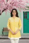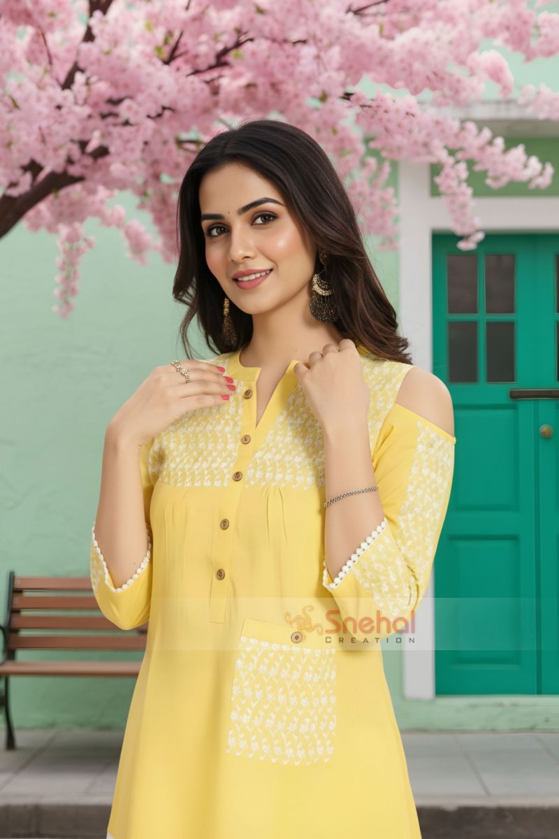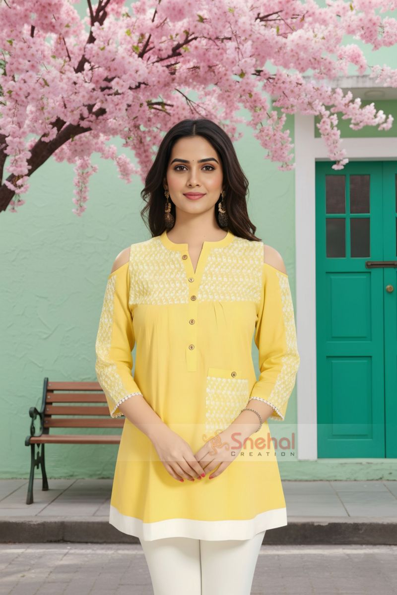 Spruce up the dress up game in this Summer Delight Short Chicken Tunic with Cold Shoulder Sleeve Style from the house of Snehal Creations. Grab this vibrant piece that is short and is made out of excellent quality cotton and chicken fabrics. The tunic features a ban collared neckline with chicken fabric under it. The main body of the tunci carries an A-line silhouette and has a pocket made of chicken fabric towards its side. Slim white lace adorns the sleeves at the edges.
