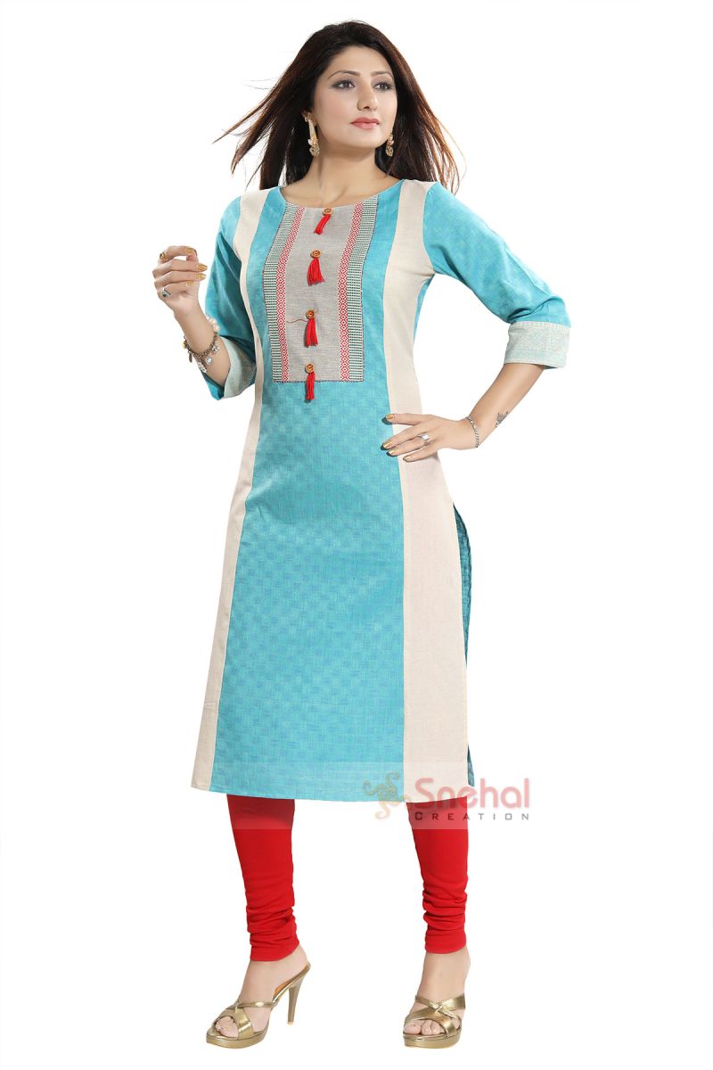 Styling comes easy in this Tantalising T. Blue Textured Cotton Straight Tunic with Pom Pom Accessory from the house of Snehal Creations. This round neck straight fit tunic has three fourth sleeves. The body of the tunic has three panels featuring blue textured fabric in the centre and white fabric on either sides. There is a red and balck printed broad neck panel in white that comes decorated with pom pom buttons. The sleeves are blue in color and features a printed white border at edges.