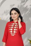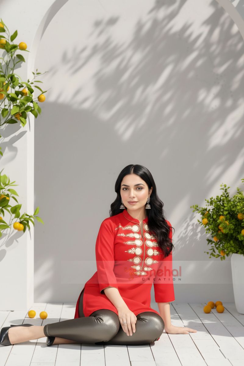 Wake up to be the Ultra Chica avatar of your own self when you fill your closet with stylish pieces like this Style Sizzle Tomato Red Georgette Tunic for Women with Embroidery designed by Snehal Creations. The georgette tunic is designed to have a ban collar neck and three fourth sleeves with rounded edges at the base. A unique embroidery pattern adorns the tunic on either sides of the neck panel and breathes zest into the look of the piece. March with pride for this piece is one for its kind, when it comes to design!