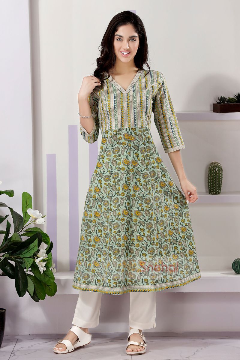 Trendy Pista Color Cotton Anarkali Kurti With Mix And Match Prints