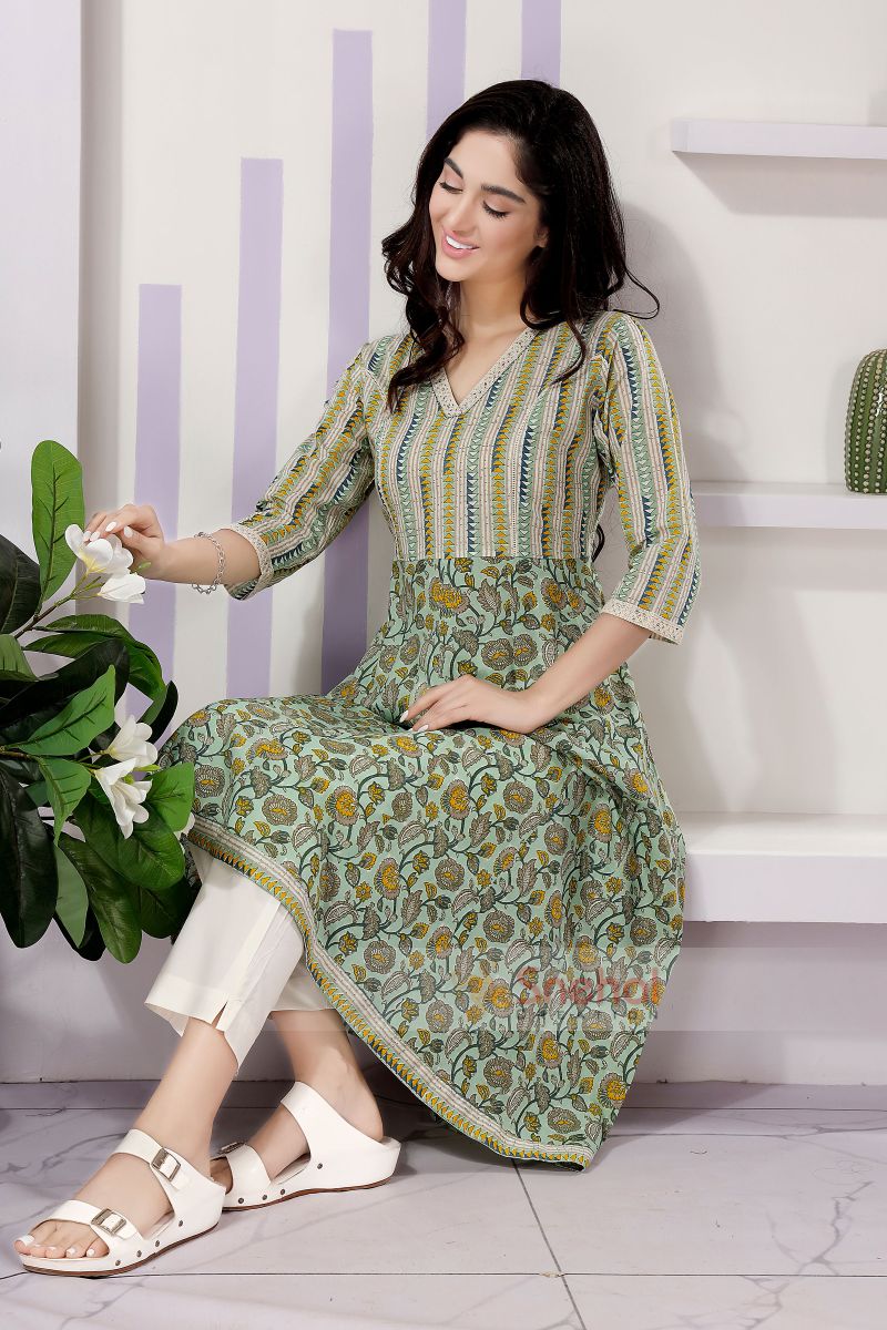 Discover elegance with our Trendy Pista Color Cotton Anarkali Kurti with Mix and Match Prints, crafted from high-quality cotton for unmatched comfort and style. This kurti features a vibrant coral hue, beautifully complemented by mixed print patterns that add a unique and contemporary touch. The Anarkali silhouette provides a flattering fit, while the breathable cotton fabric ensures all-day comfort. Perfect for casual outings, festive occasions, or everyday wear, this kurti combines traditional charm with modern aesthetics. Pair it with your favorite leggings or palazzos to complete the look. Embrace the blend of style and comfort with this must-have addition to your ethnic wardrobe.