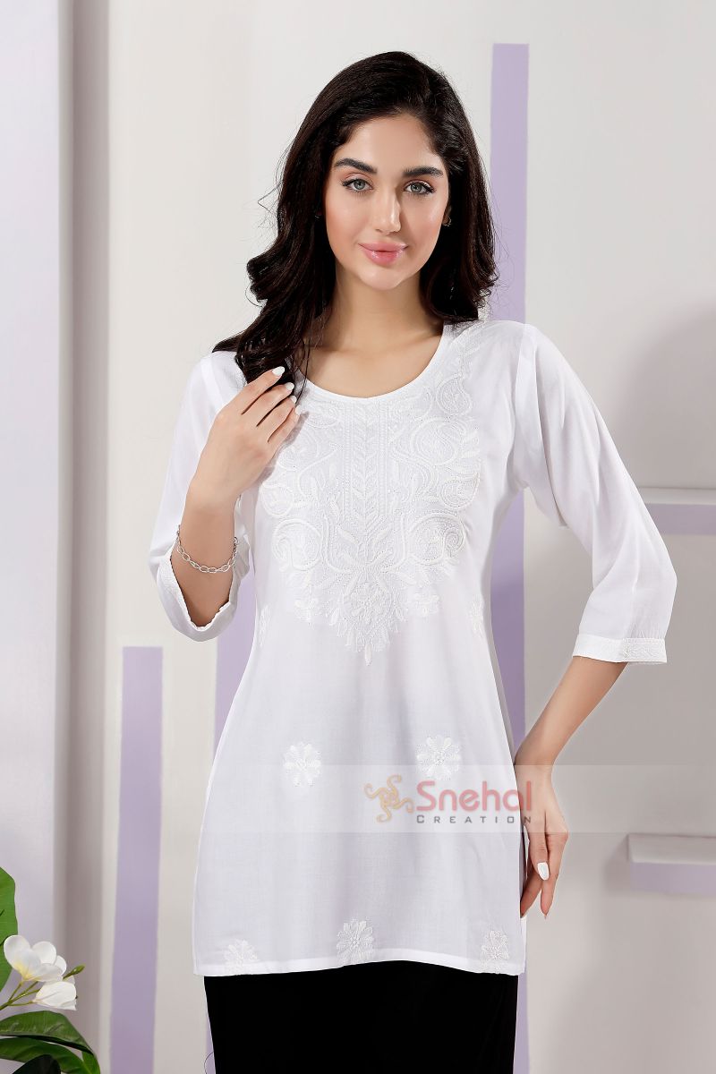 Beautiful-White-Rayon-Kurti-with-Handcrafted-Chikankari Beautiful-White-Rayon-Kurti-with-Handcrafted-Chikankari Elegant White Rayon Short Kurti with Chikankari Workiful Chikankari Embroidery Elegant White Rayon Short Kurti with Chikankari Workiful Chikankari Embroidery