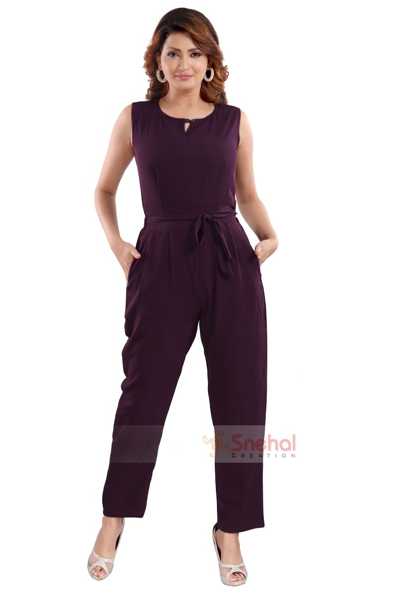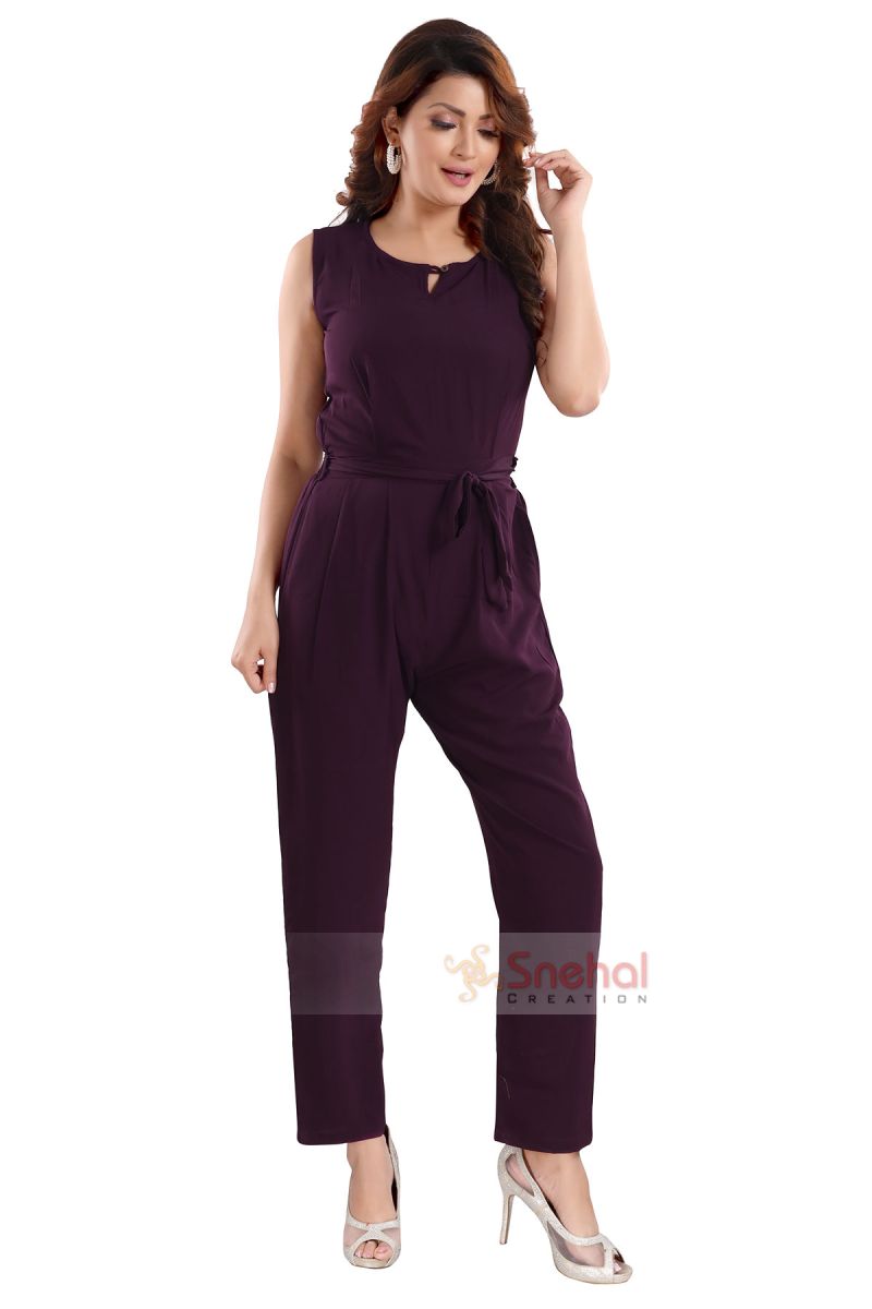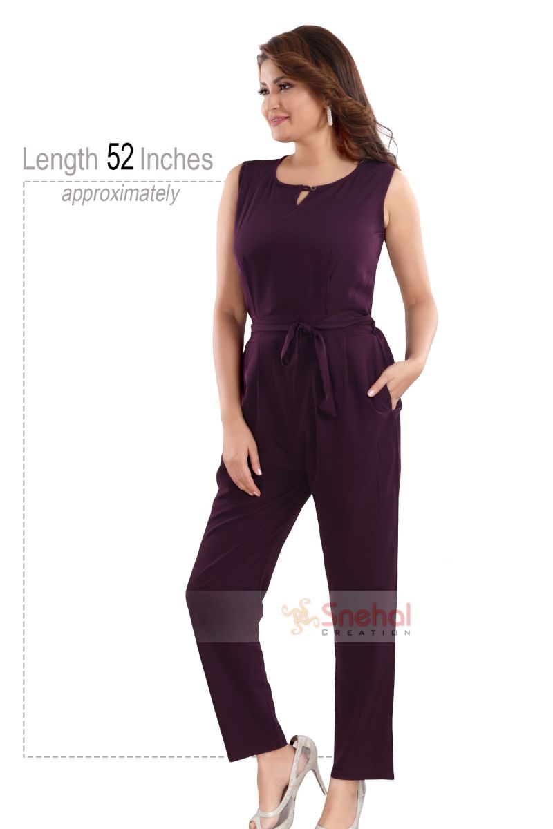 Relaxed fit full length sleeveless jumpsuit for regular wear. The elasticated waist and comfortable hip silhouette are perfect for the Indian body type. Length of the maxi is for the average Indian woman's height. Made from smooth, wrinkle resistant poly. crepe fabric, this jumpsuit is sure to look trendy. It is color bleeding resistant, thereby making it long lasting.