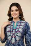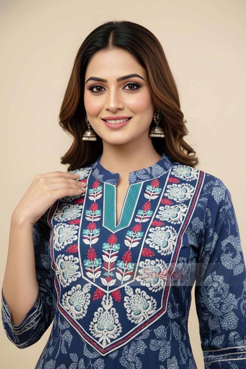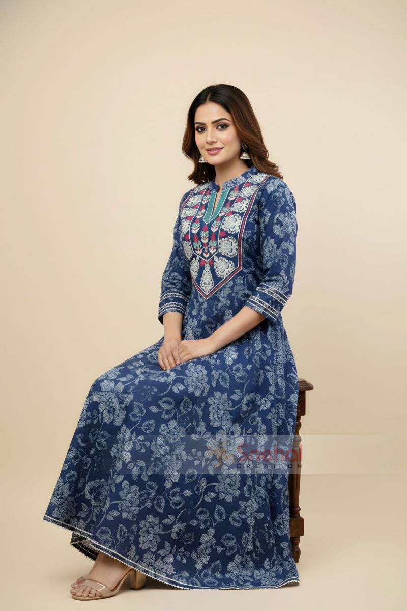 True Blue Cotton Anarkali With Embroidery Yoke and Tussles. Full umbrella flair of 28 kalis for a graceful look.