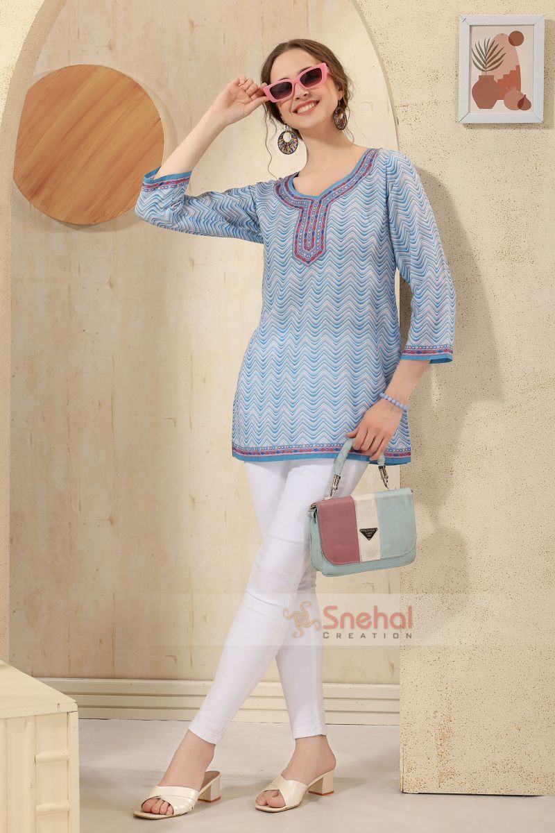 Turquoise Jaipuri Cotton Zig Zag Print Round Neck Short Tunic Top