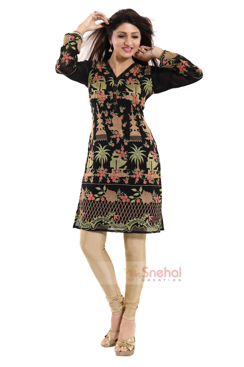 Turn heads around as you walk into a room in this Unique Style Black Fine Georgette Short Tunic With Exotic Embroidery from Snehal Creations. This V-neck tunic steals the show its beautiful multi-coloured embroidery on a black backdrop. The length is short and the piece features full sleeves with embroidery panels in the front. Team it up with a pair of beige leggings and there you go!