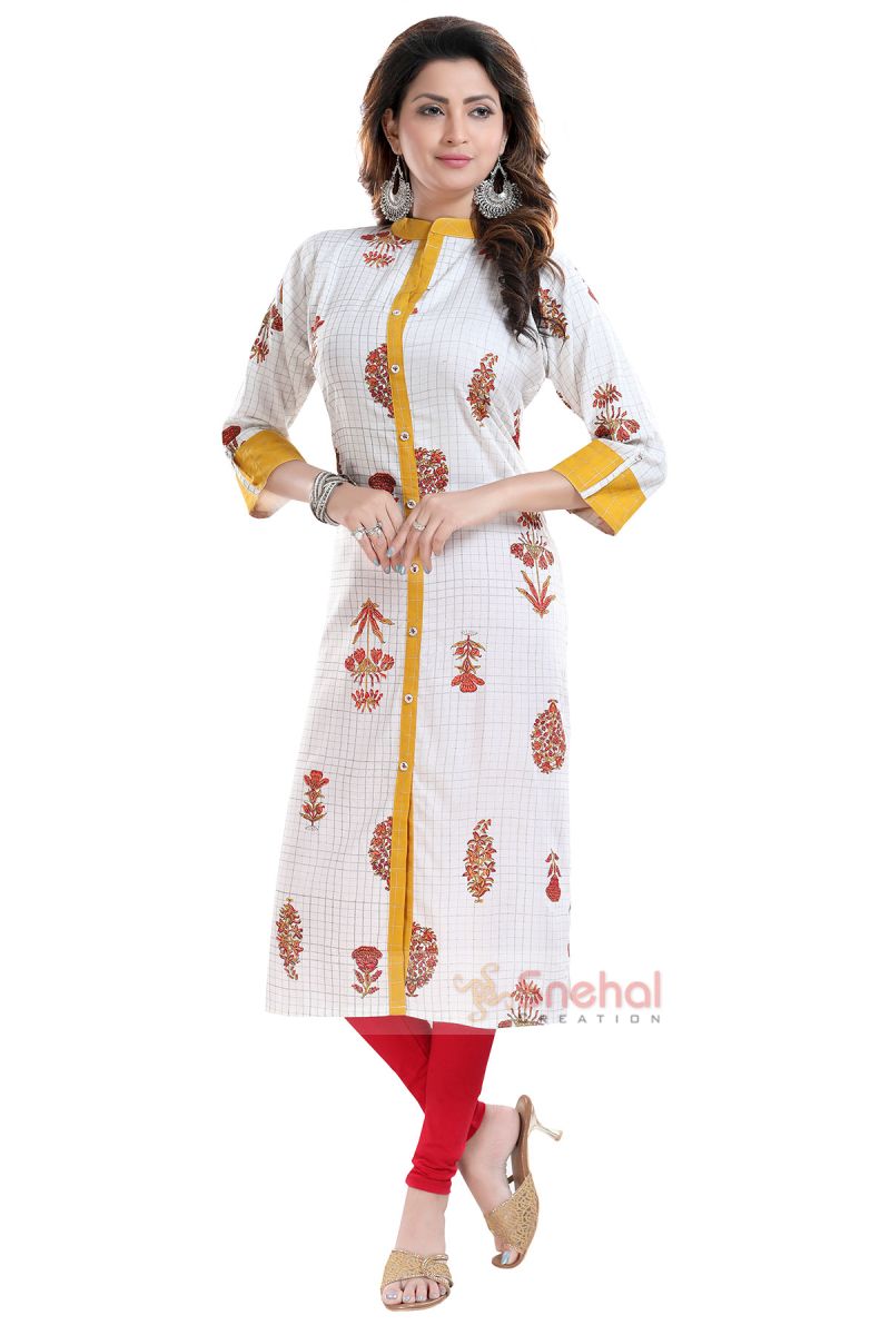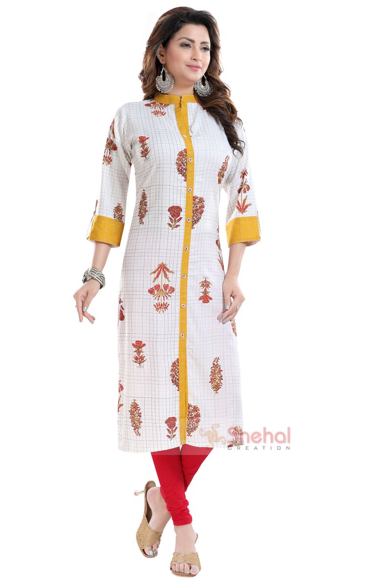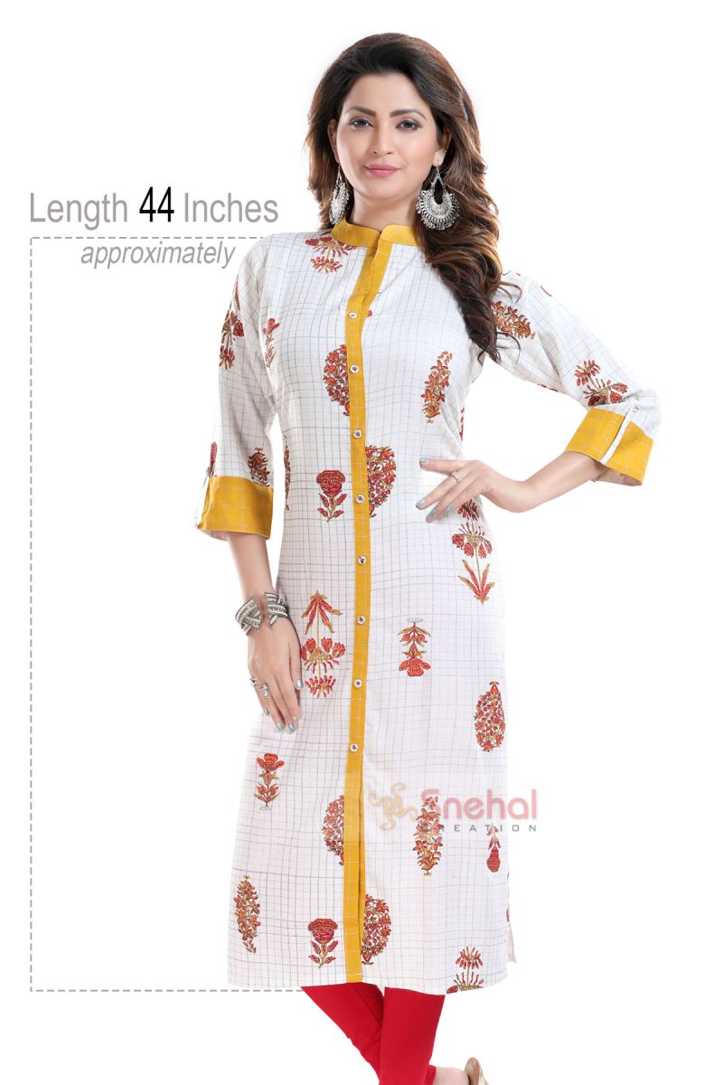 Look drop dead gorgeous in this Vibrance Checkered White and Yellow Rayon Cotton Long Kurti for Women from the house of Snehal Creations. Crafted out of a subtly checkered fabric with motif design, this ban collared piece comes with three fourth sleeves. The neckline, front open tapping sleeve cuffs are crafted out of yellow coloured fabric that provides a decent accent to the look.