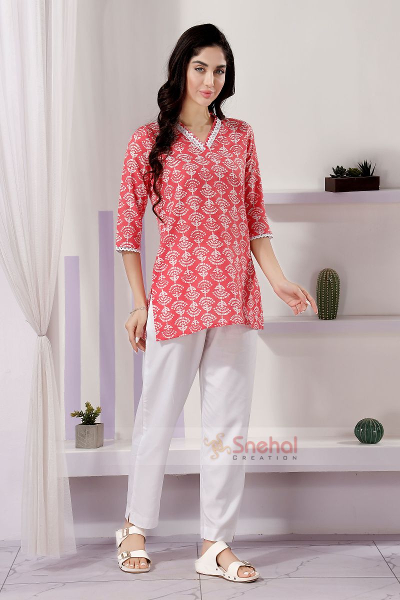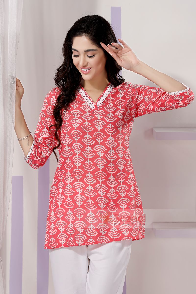 Vibrant Tomato Color V Neck Kurti With Delicate Lace Embellishments