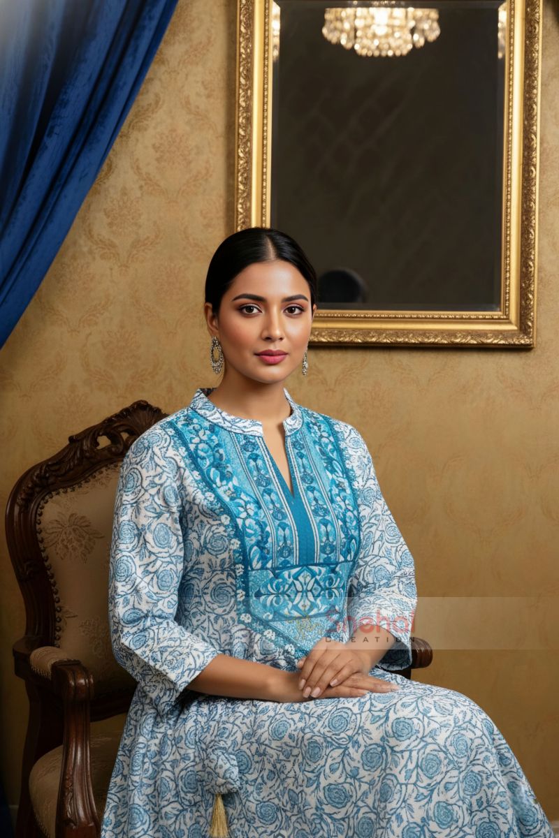 Elegant Blue Floral Print Cotton Short Kurti with Round Neck