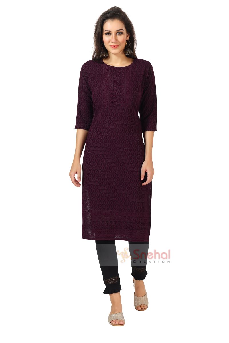Out of clothes for your everyday looks? Have a look at this magnificent rayon wine color chikan-kari embroidery kurta exclusively designed and sold by Snehal Creations. The pretty wine color below the knee length kurta with a round neckline makes it appropriate for office and college wear. The 3/4th sleeves and below knee length makes it very comfortable for those long working days. It is made from fine quality rayon and has chikan-kari embroidery all over which looks very appealing. Pair this kurta with your favorite jhumkis and jutti and get showered with tonnes of compliments.