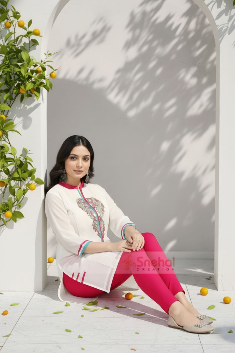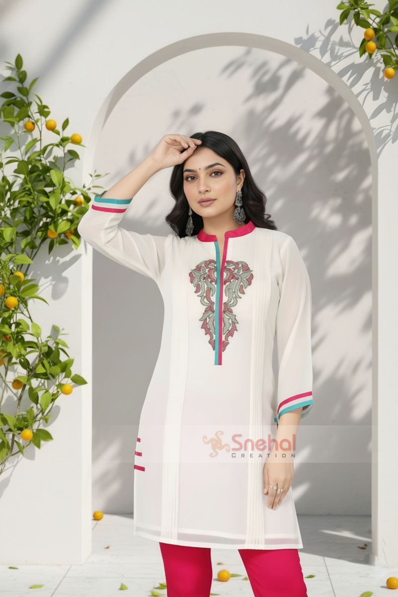 A fresh breeze of style rocks the air when you swaddle yourself in this Witty in White Short Tunic for Women from Snehal Creations. The kurti has been tailored out of plain white fabric, with multi coloured embroidery adorning its ban neck and neck collar. Additionally, some pintex strips run vertically equidistant from the neck. Red and blue taping on the collar, gala patti and sleeves make a fine sight!