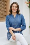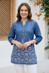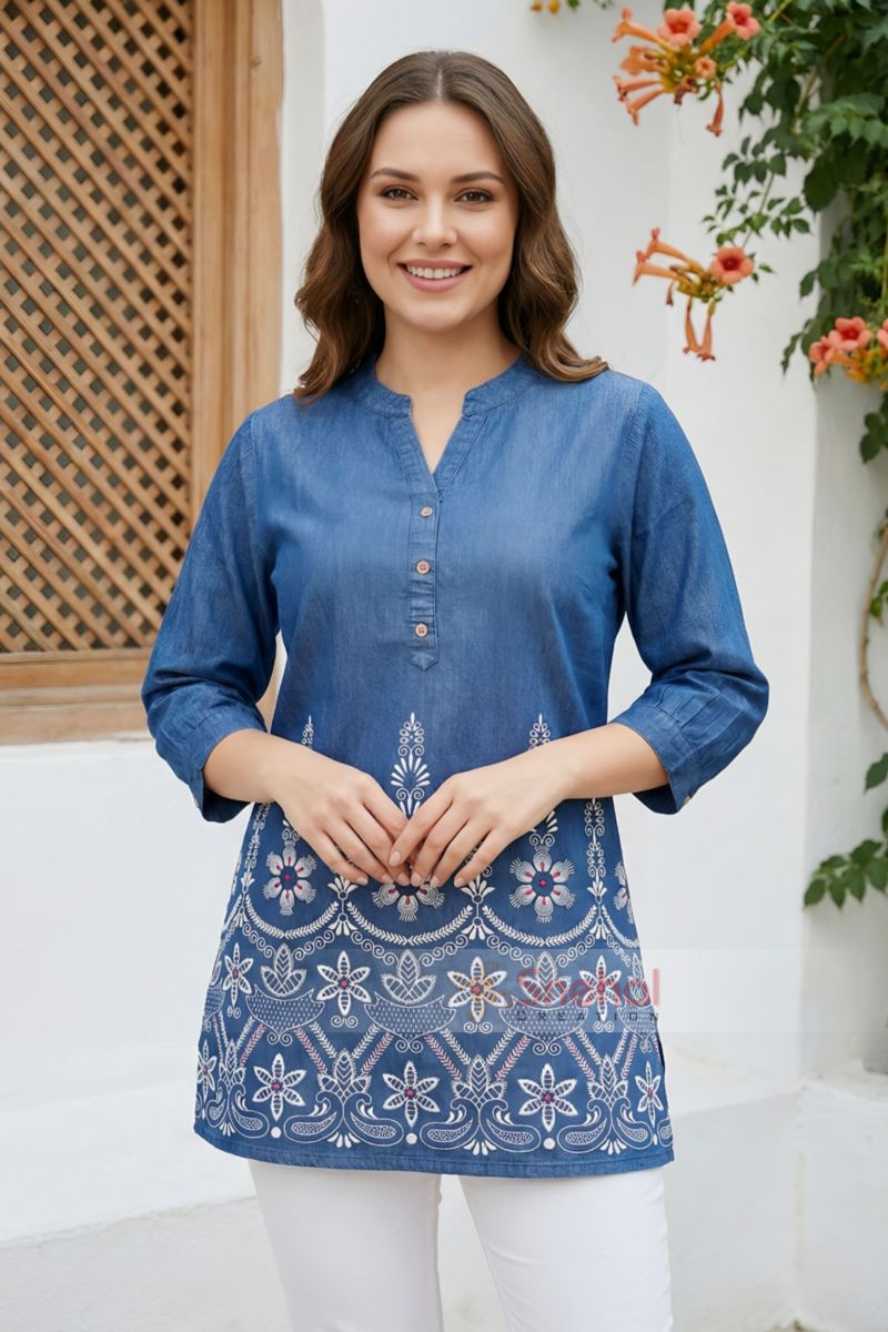 Premium soft denim fabric Stylish printed design enhanced with embroidery Modern ban collar (mandarin collar) neckline Comfortable 3/4 sleeves Smart casual and office wear friendly Indo-western fusion style Easy to style with pants, leggings, or denim